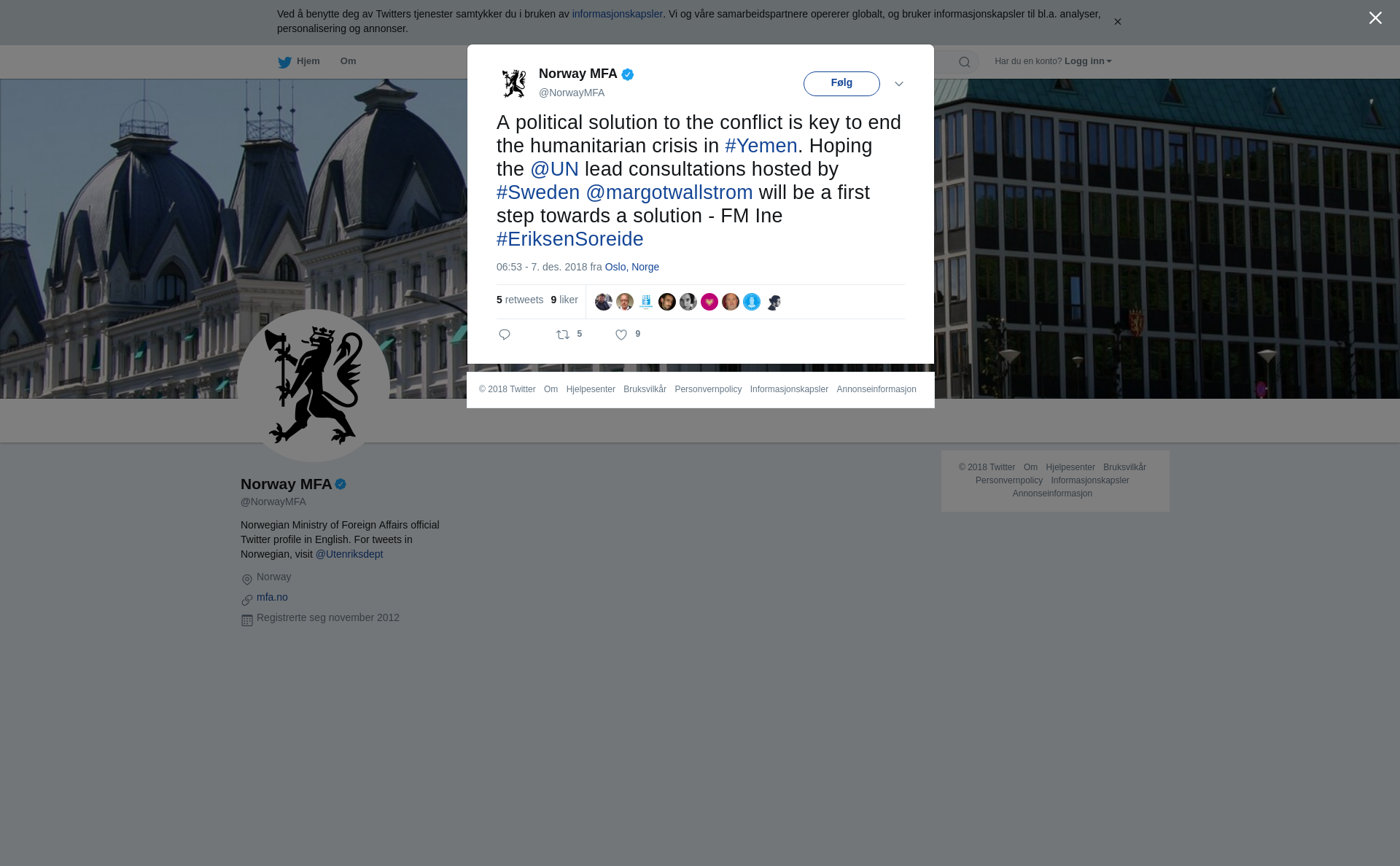 A political solution to the conflict is key to end the humanitarian crisis in #Yemen. Hoping the @UN lead consultations hosted by #Sweden @margotwallstrom will be a first step towards a solution - FM Ine #EriksenSoreide