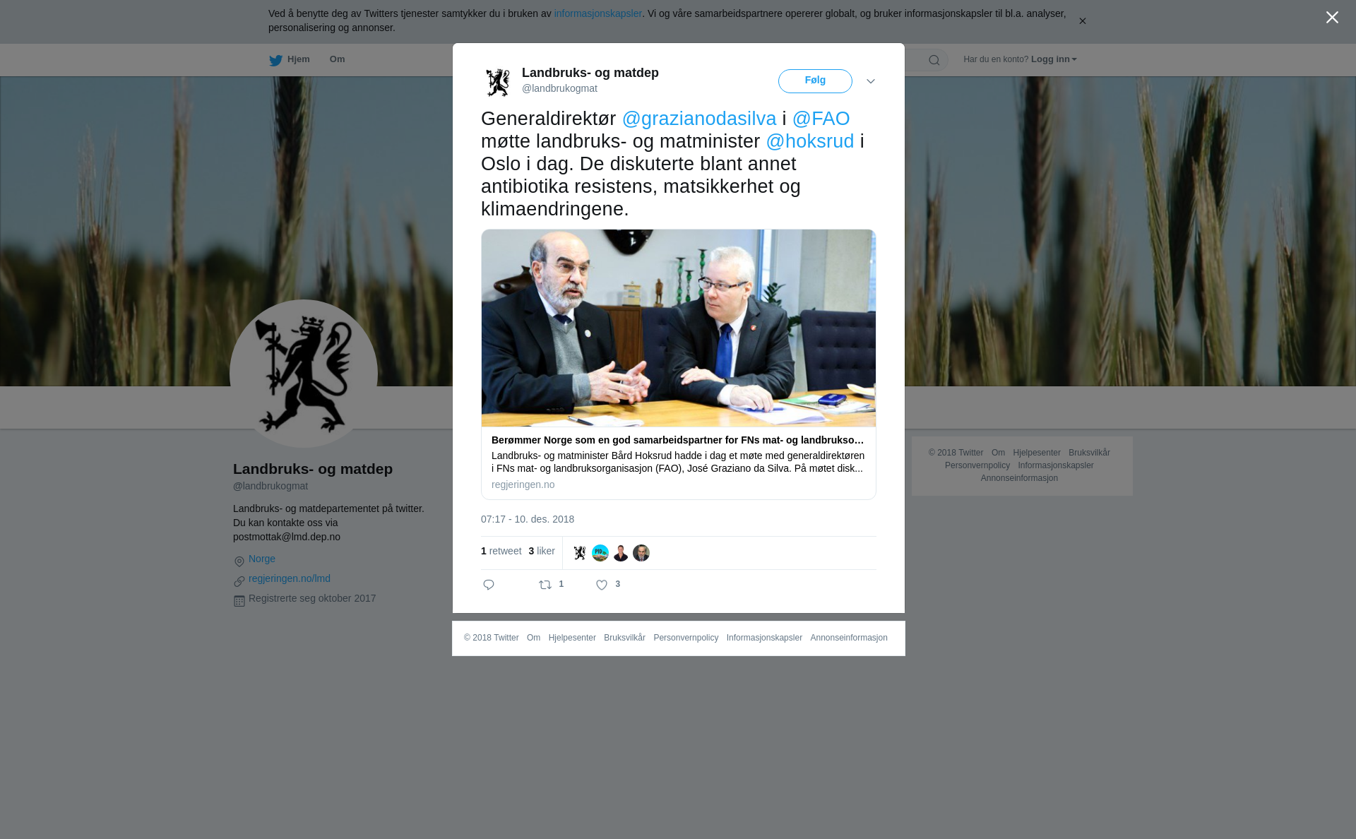 Landbruks- og matminister Bård Hoksrud hadde i dag et møte med generaldirektøren i FNs mat- og landbruksorganisasjon (FAO), José Graziano da Silva. På møtet diskuterte de flere tema av felles interesse for FAO og Norge.