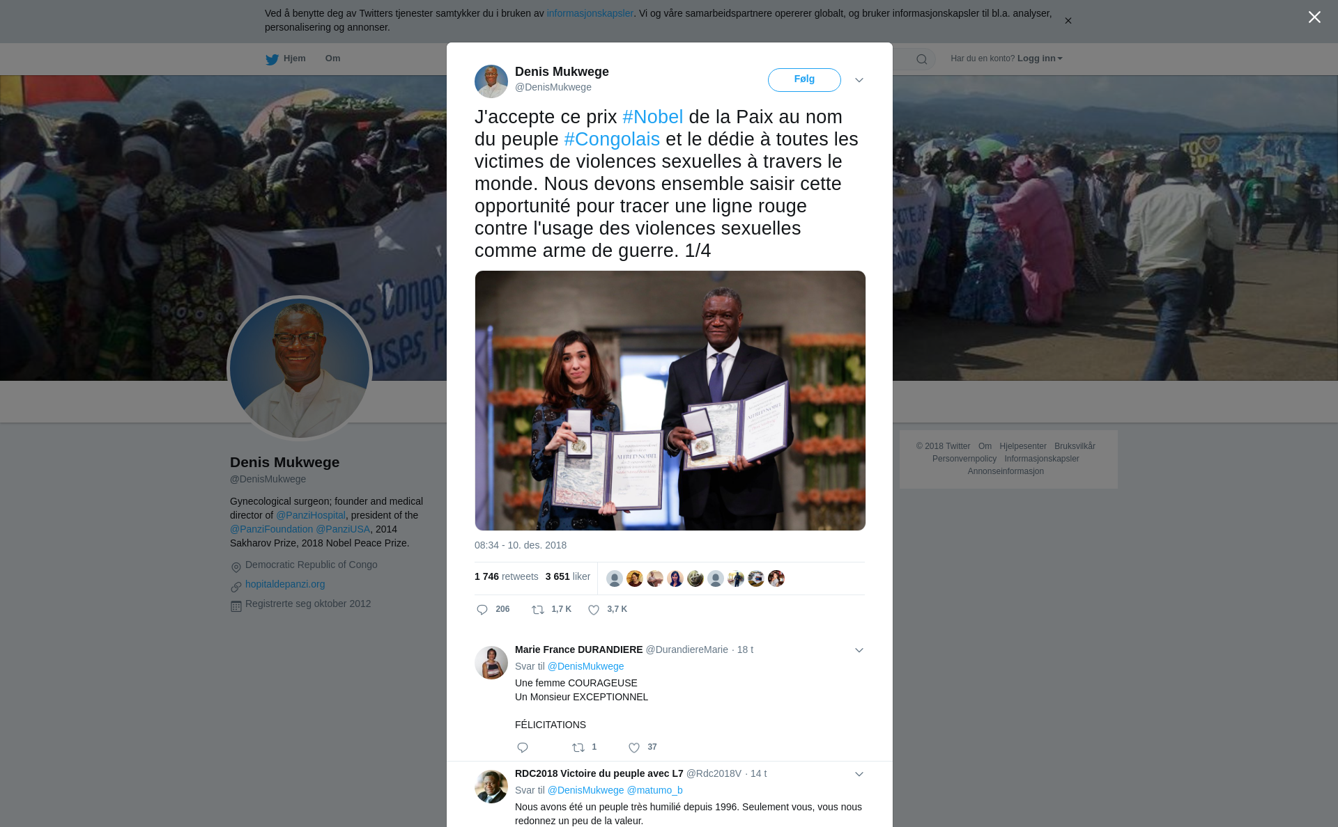RT @DenisMukwege: J'accepte ce prix #Nobel de la Paix au nom du peuple #Congolais et le dédie à toutes les victimes de violences sexuelles à travers le monde. Nous devons ensemble saisir cette opportunité pour tracer une ligne rouge contre l'usage des violences sexuelles comme arme de guerre. 1/4 https://t.co/UuAFBHzt6u