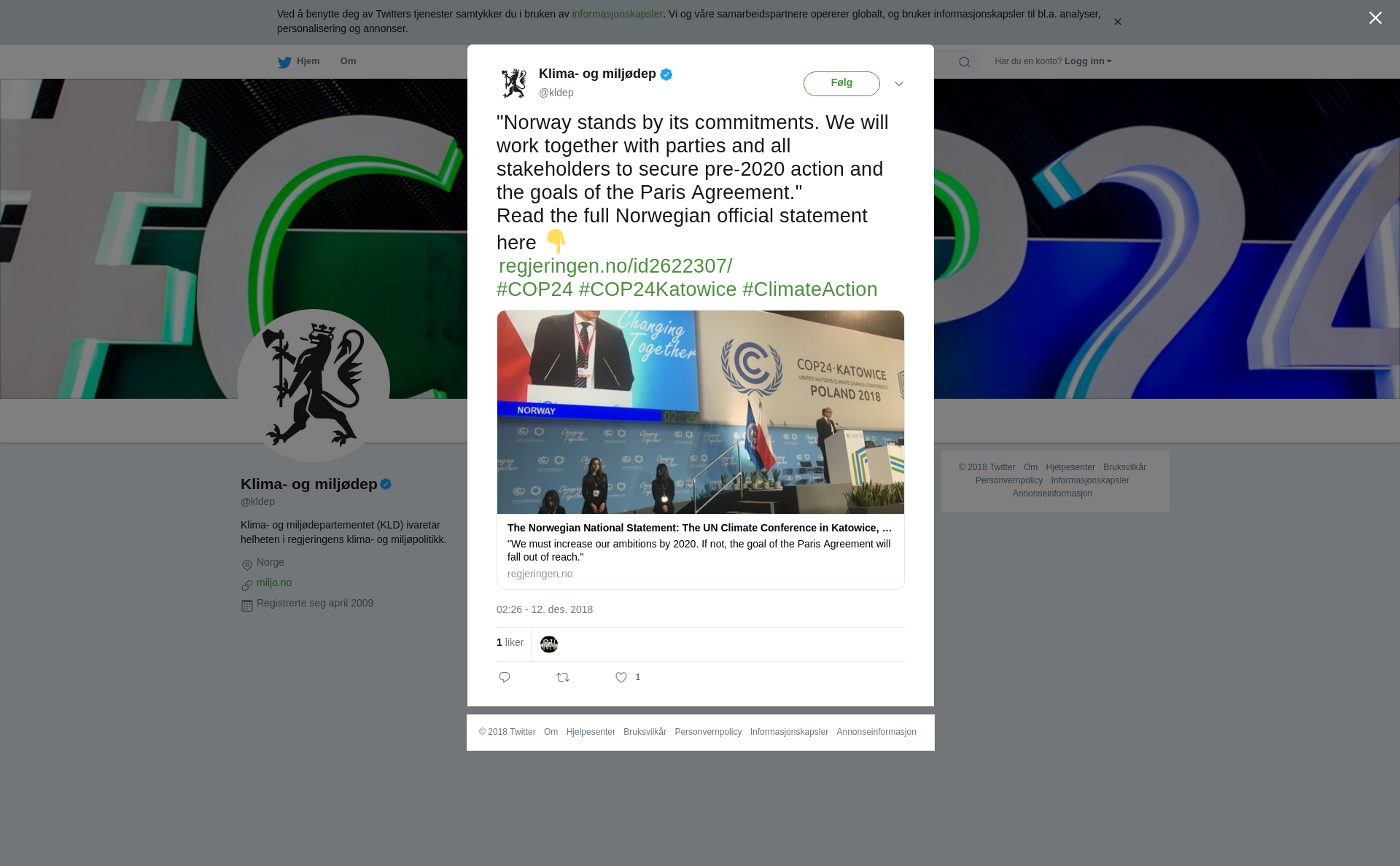"Norway stands by its commitments. We will work together with parties and all stakeholders to secure pre-2020 action and the goals of the Paris Agreement."