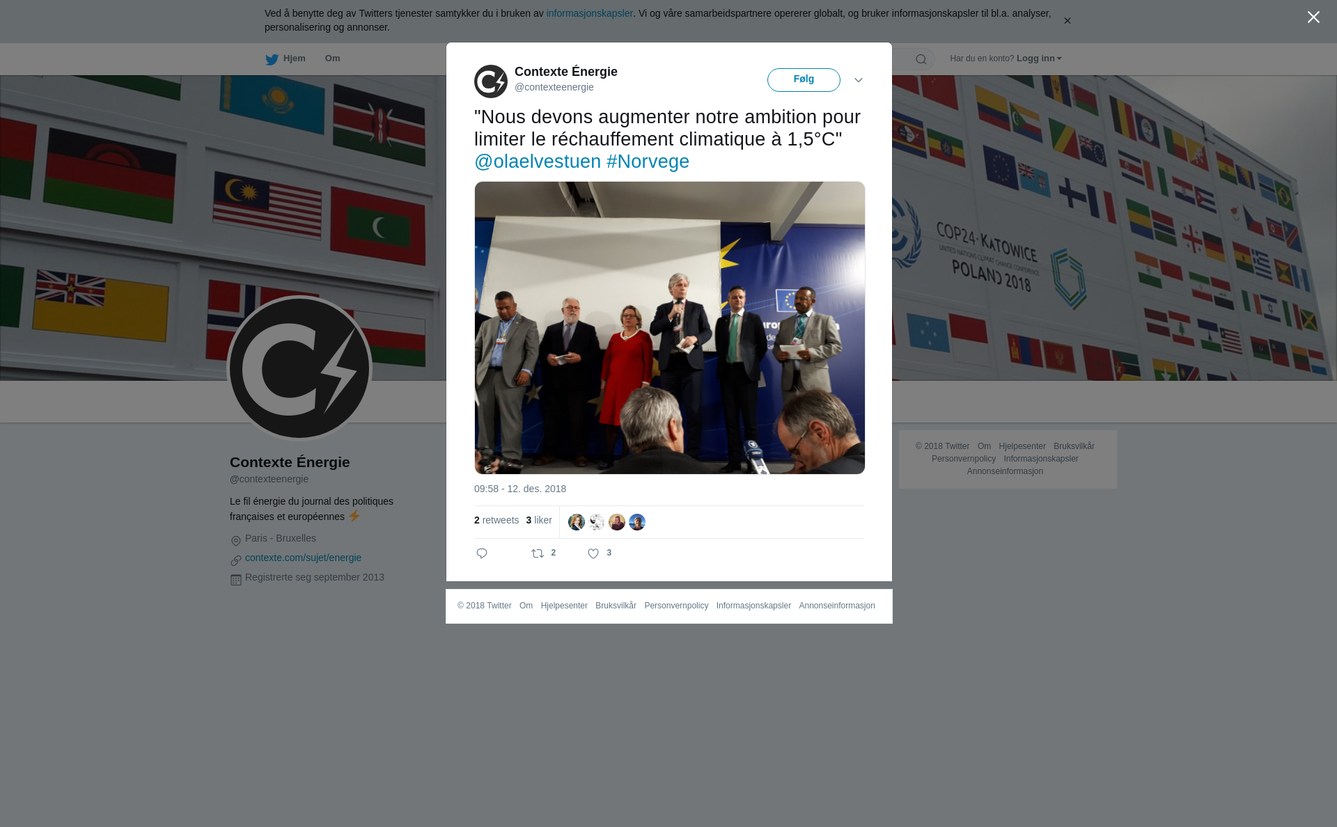 RT @contexteenergie: "Nous devons augmenter notre ambition pour limiter le réchauffement climatique à 1,5°C" @olaelvestuen #Norvege https://t.co/ccc4jmwxhb