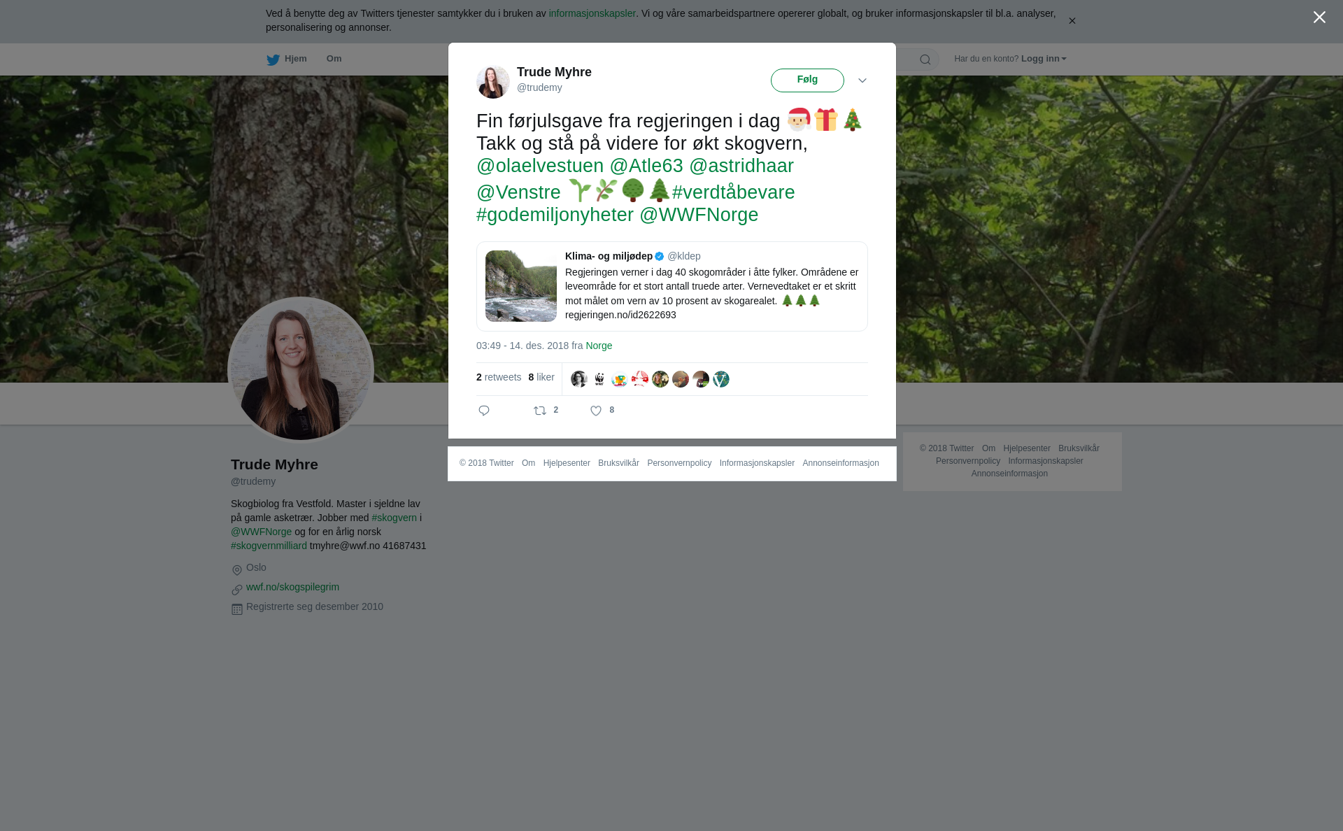 RT @trudemy: Fin førjulsgave fra regjeringen i dag 🎅🏼🎁🎄 Takk og stå på videre for økt skogvern, @olaelvestuen @Atle63 @astridhaar @Venstre 🌱🌿🌳🌲#verdtåbevare #godemiljonyheter @WWFNorge https://t.co/wMjj1q6oF8