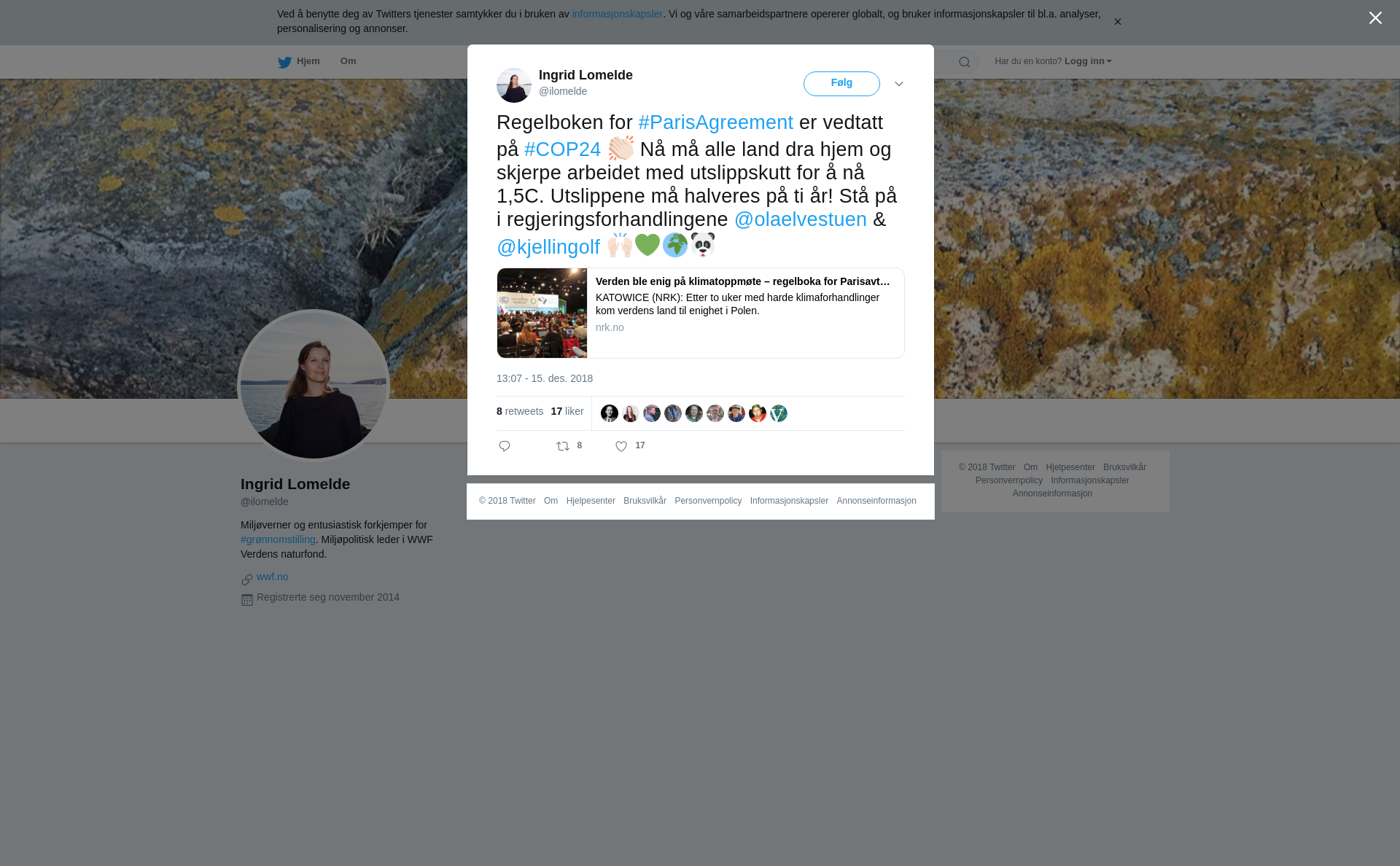 RT @ilomelde: Regelboken for #ParisAgreement er vedtatt på #COP24 👏🏻 Nå må alle land dra hjem og skjerpe arbeidet med utslippskutt for å nå 1,5C. Utslippene må halveres på ti år! Stå på i regjeringsforhandlingene @olaelvestuen & @kjellingolf 🙌🏻💚🌍🐼 https://t.co/XyHV5SY5kw