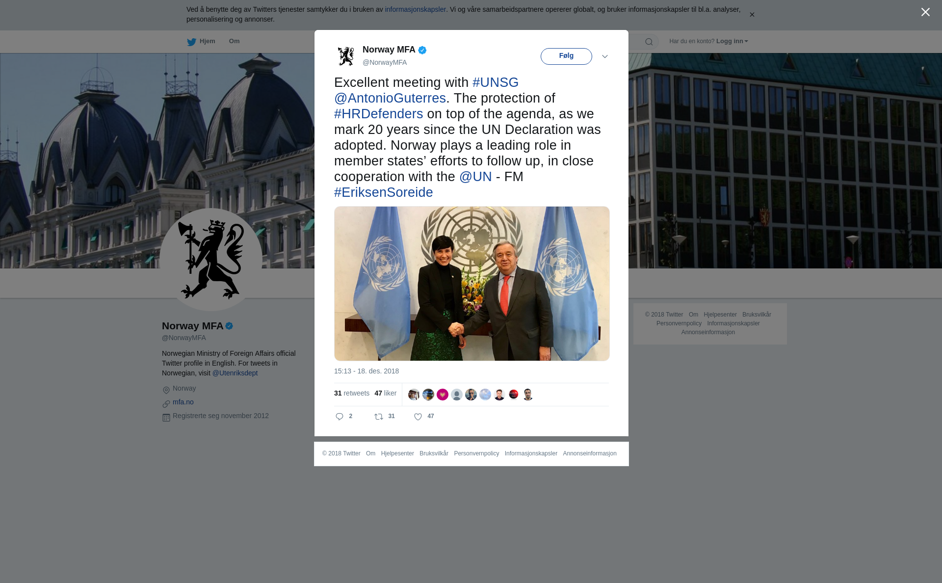 Excellent meeting with #UNSG @AntonioGuterres. The protection of #HRDefenders on top of the agenda, as we mark 20 years since the UN Declaration was adopted. Norway plays a leading role in member states’ efforts to follow up, in close cooperation with the @UN - FM #EriksenSoreide https://t.co/c1WqV0Xy35