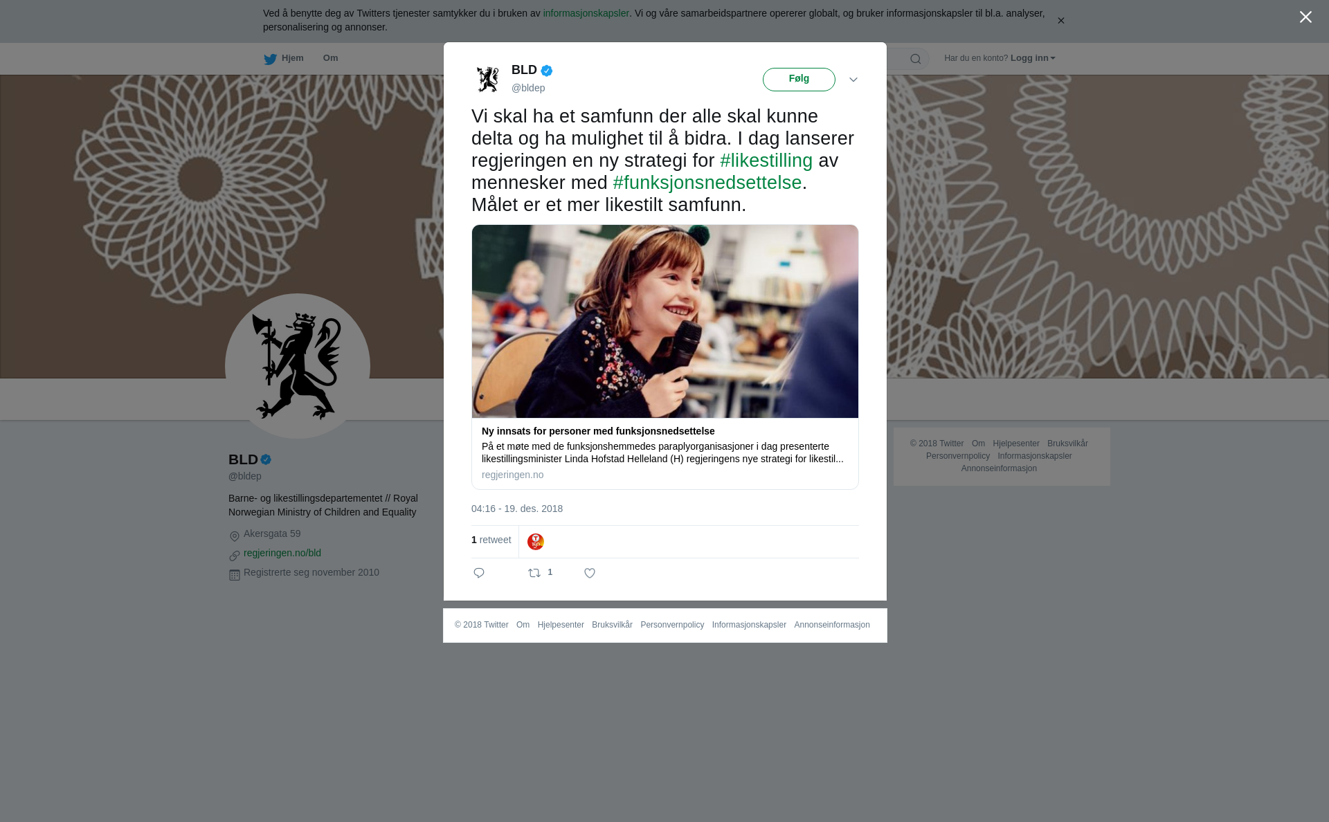 På et møte med de funksjonshemmedes paraplyorganisasjoner i dag presenterte likestillingsminister Linda Hofstad Helleland (H) regjeringens nye strategi for likestilling av personer med funksjonsnedsettelse, Et samfunn for alle.