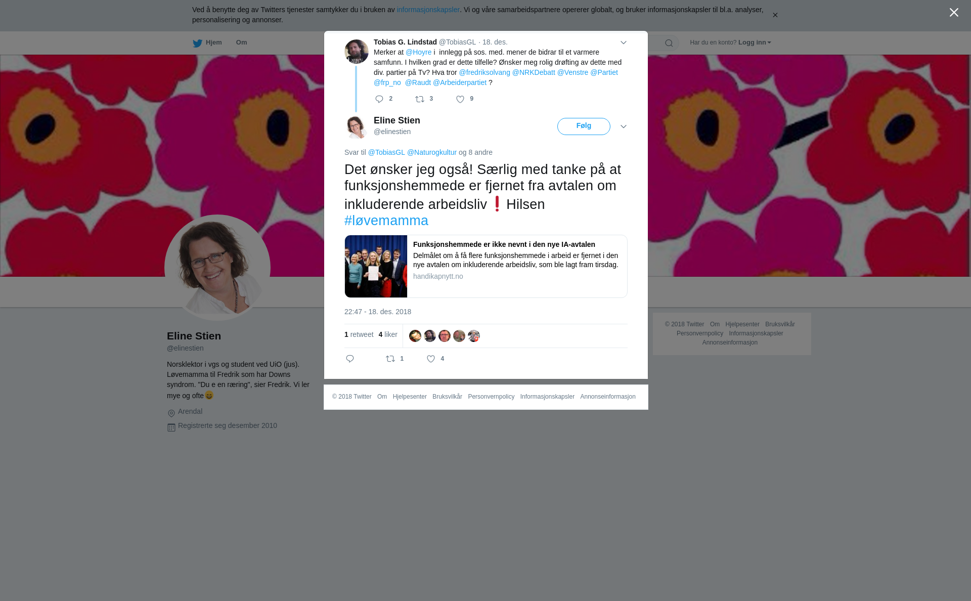 RT @elinestien: @TobiasGL @Naturogkultur @Hoyre @fredriksolvang @NRKDebatt @Venstre @Partiet @frp_no @Raudt @Arbeiderpartiet Det ønsker jeg også! Særlig med tanke på at funksjonshemmede er fjernet fra avtalen om inkluderende arbeidsliv❗️Hilsen #løvemamma