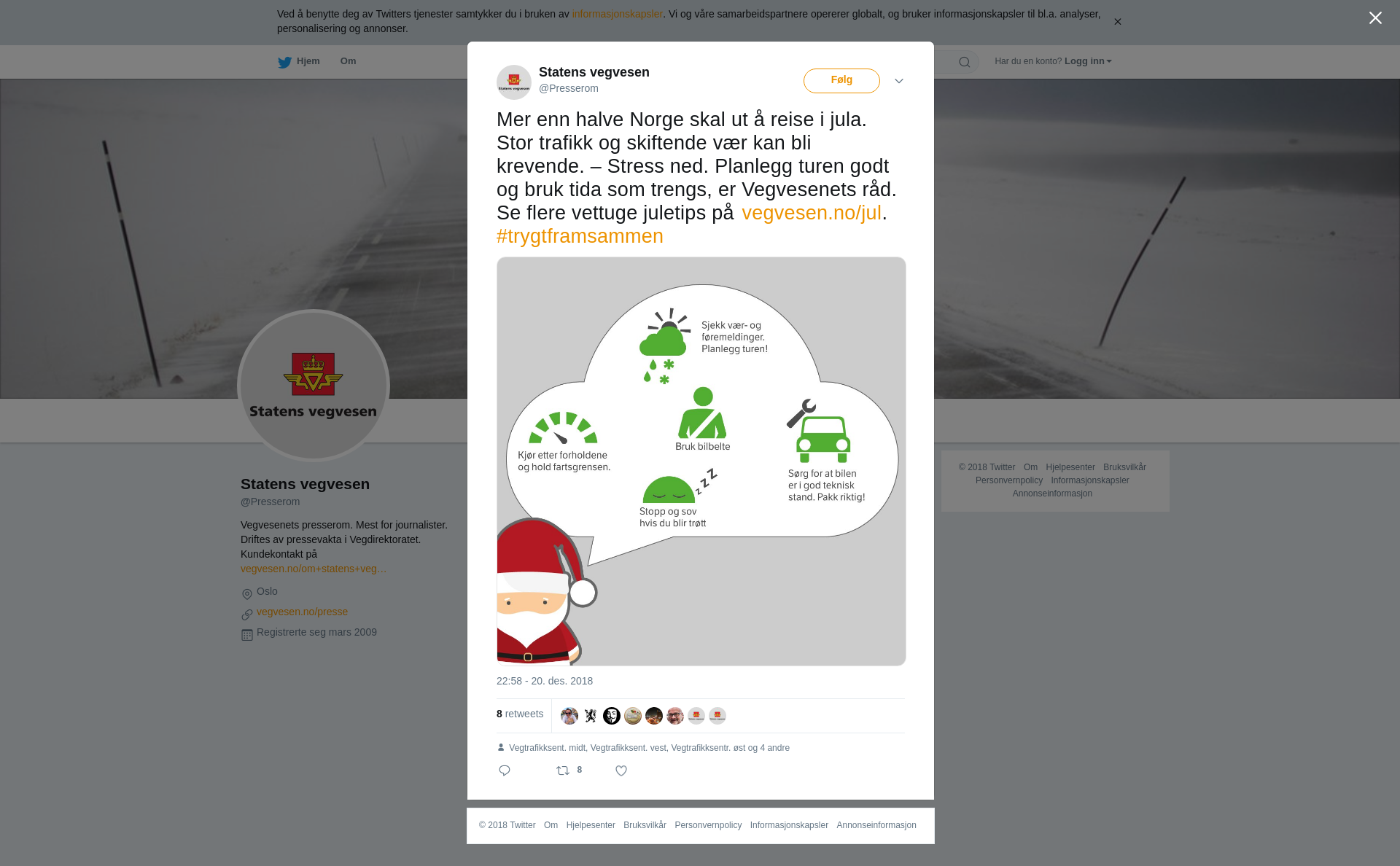 RT @Presserom: Mer enn halve Norge skal ut å reise i jula. Stor trafikk og skiftende vær kan bli krevende. – Stress ned. Planlegg turen godt og bruk tida som trengs, er Vegvesenets råd. Se flere vettuge juletips på https://t.co/J9Ji8rKdRJ. #trygtframsammen https://t.co/0AW9bmAgQ5