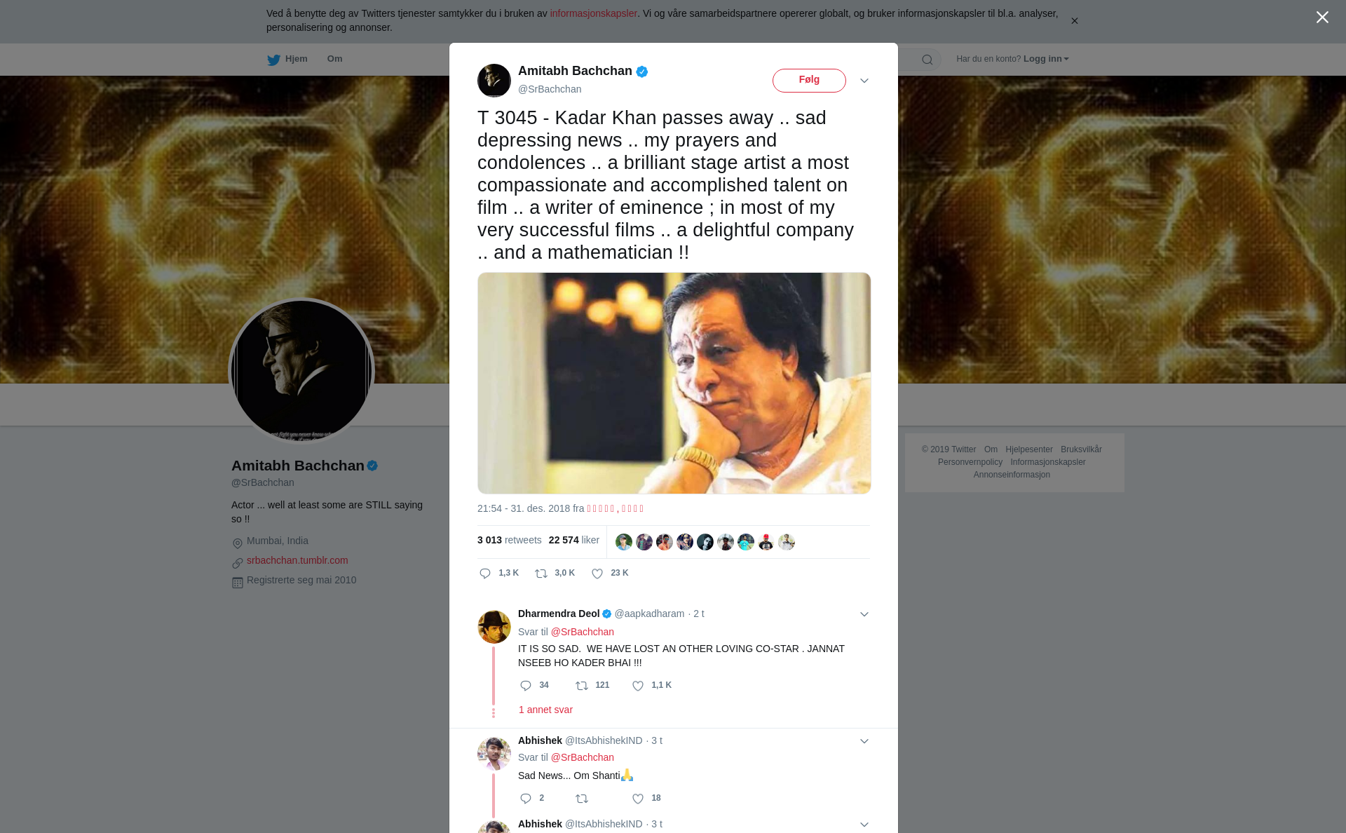 RT @SrBachchan: T 3045 - Kadar Khan passes away .. sad depressing news .. my prayers and condolences .. a brilliant stage artist a most compassionate and accomplished talent on film .. a writer of eminence ; in most of my very successful films .. a delightful company .. and a mathematician !! https://t.co/l7pdv0Wdu1