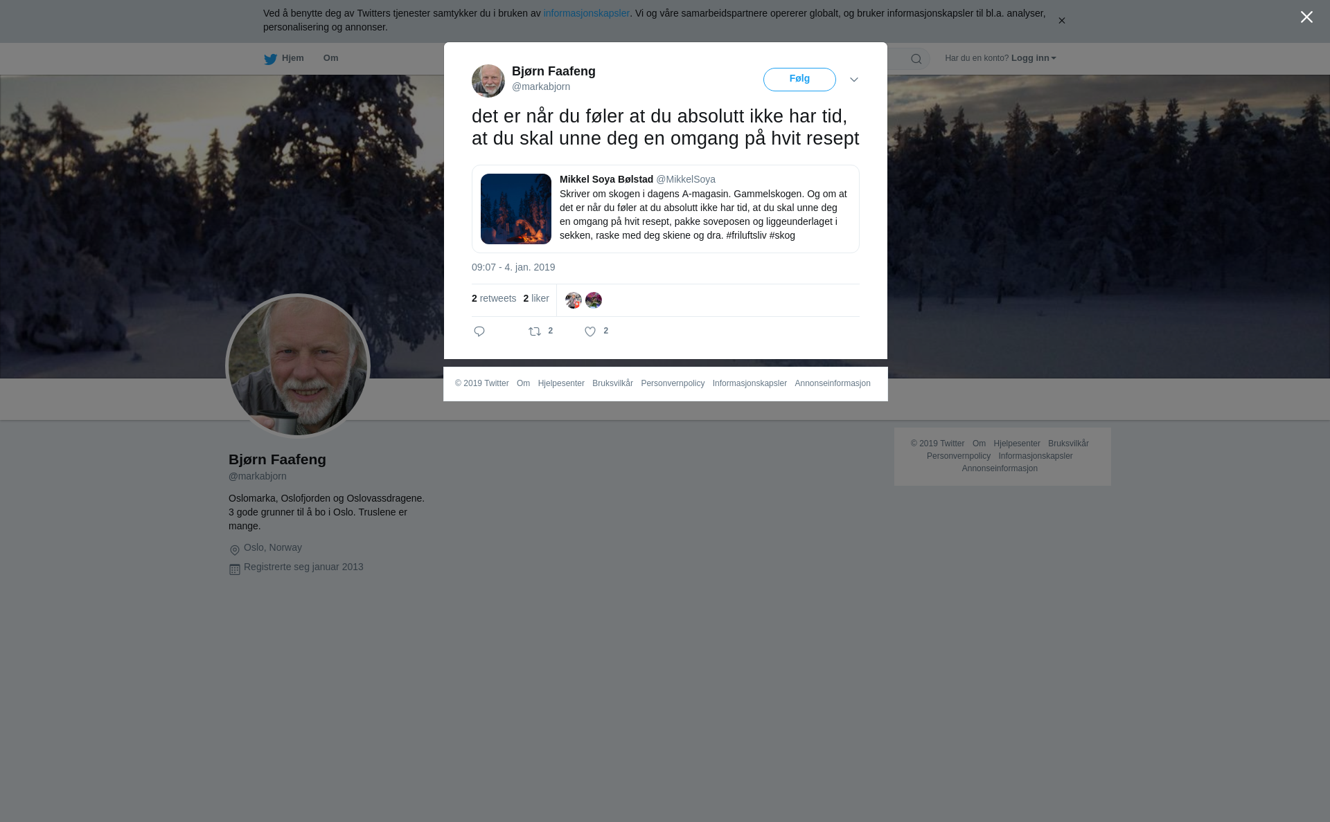 “Skriver om skogen i dagens A-magasin. Gammelskogen. Og om at det er når du føler at du absolutt ikke har tid, at du skal unne deg en omgang på hvit resept, pakke soveposen og liggeunderlaget i sekken, raske med deg skiene og dra. #friluftsliv #skog”
