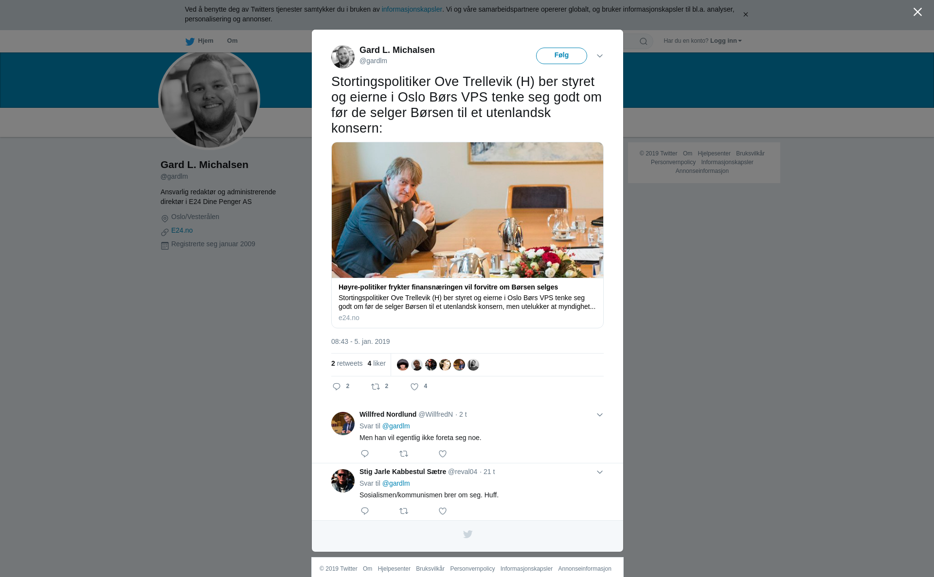 RT @gardlm: Stortingspolitiker Ove Trellevik (H) ber styret og eierne i Oslo Børs VPS tenke seg godt om før de selger Børsen til et utenlandsk konsern: https://t.co/0X4SJ5K0Ek