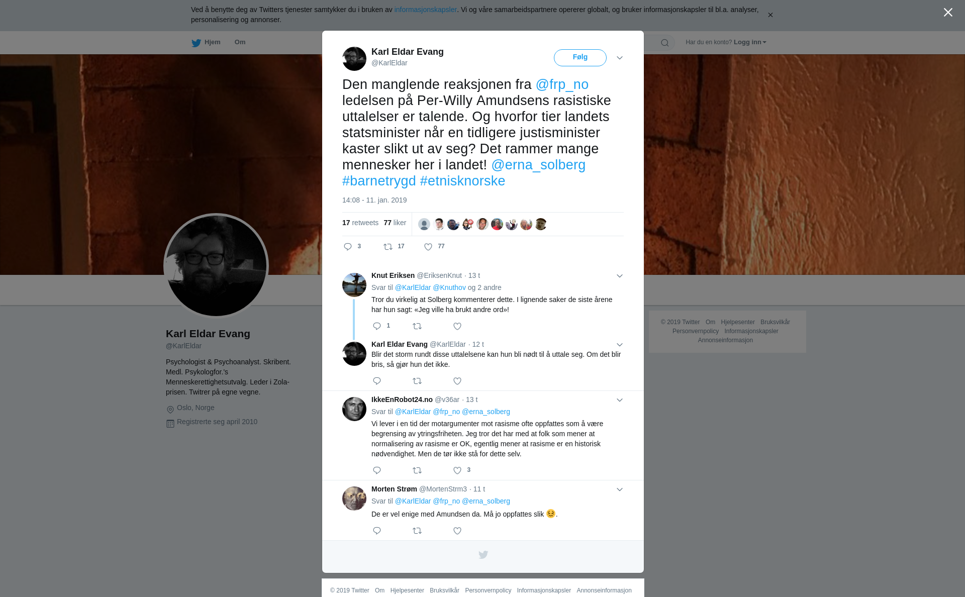 RT @KarlEldar: Den manglende reaksjonen fra @frp_no ledelsen på Per-Willy Amundsens rasistiske uttalelser er talende. Og hvorfor tier landets statsminister når en tidligere justisminister kaster slikt ut av seg? Det rammer mange mennesker her i landet! @erna_solberg #barnetrygd #etnisknorske