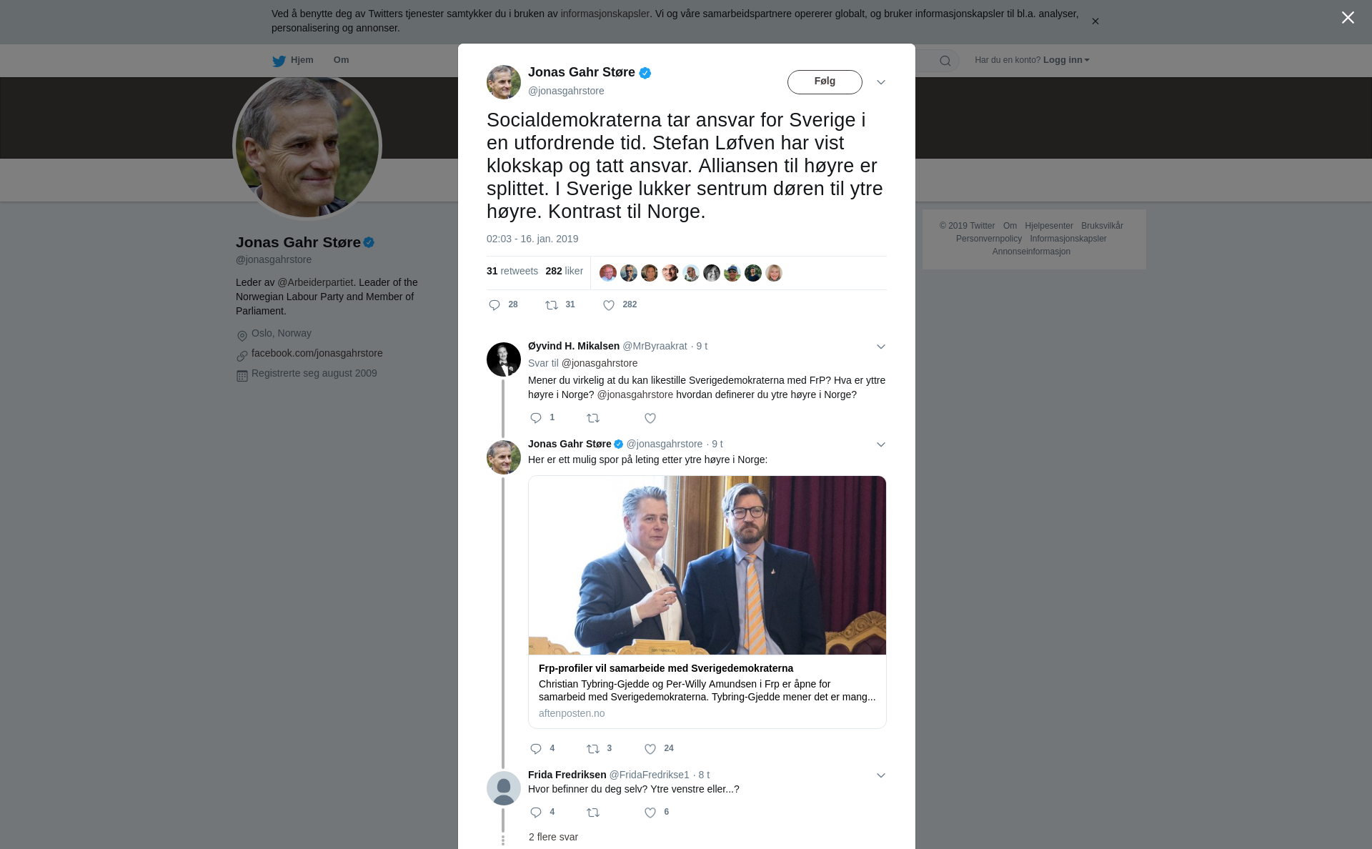 RT @jonasgahrstore: Socialdemokraterna tar ansvar for Sverige i en utfordrende tid. Stefan Løfven har vist klokskap og tatt ansvar. Alliansen til høyre er splittet. I Sverige lukker sentrum døren til ytre høyre. Kontrast til Norge.