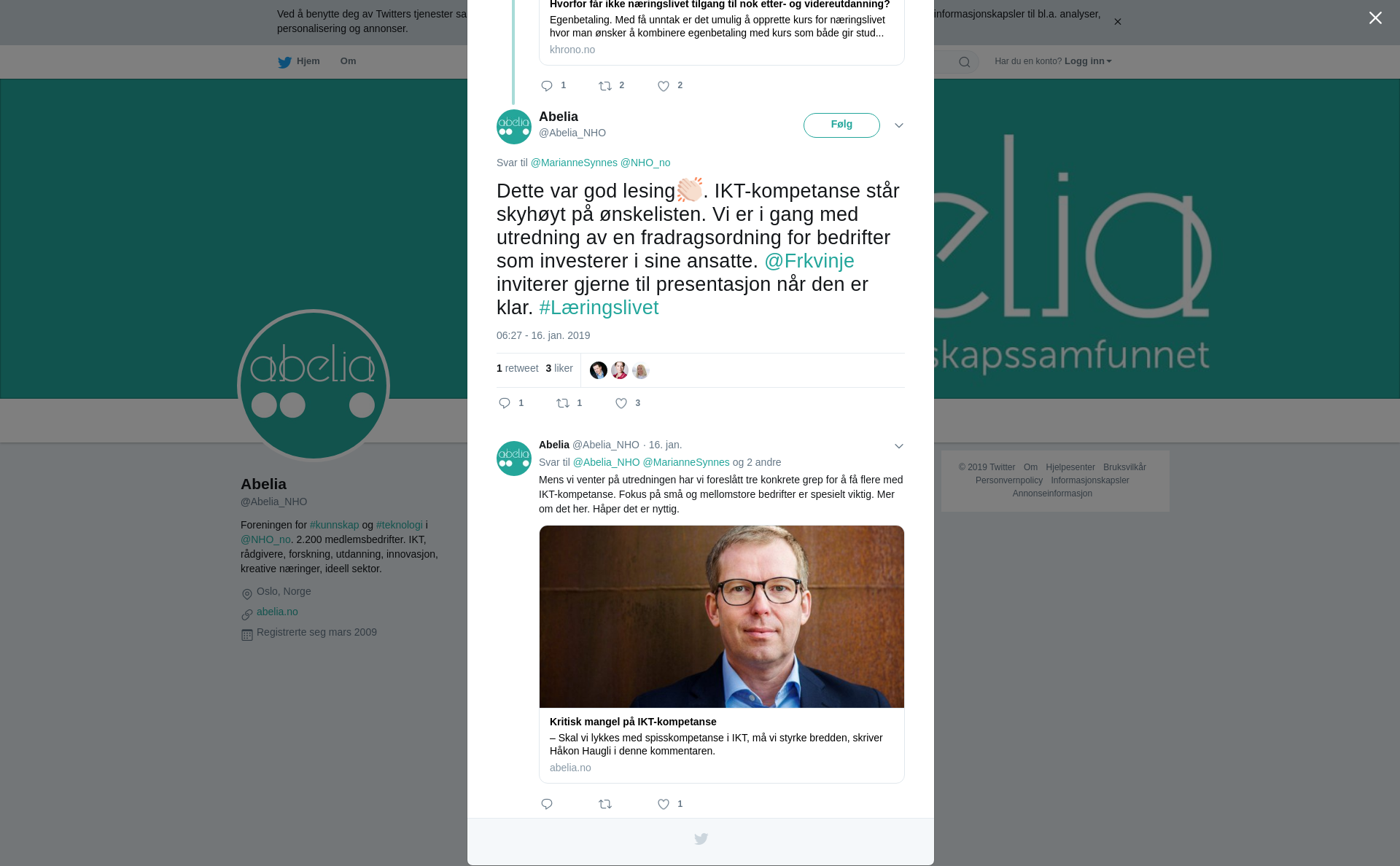 RT @Abelia_NHO: @MarianneSynnes @NHO_no Dette var god lesing👏🏻. IKT-kompetanse står skyhøyt på ønskelisten. Vi er i gang med utredning av en fradragsordning for bedrifter som investerer i sine ansatte. @Frkvinje inviterer gjerne til presentasjon når den er klar. #Læringslivet