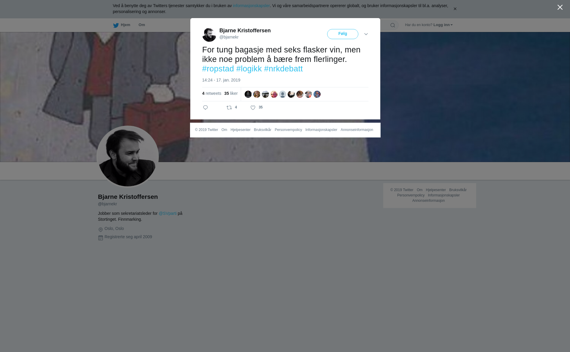 RT @bjarnekr: For tung bagasje med seks flasker vin, men ikke noe problem å bære frem flerlinger. #ropstad #logikk #nrkdebatt