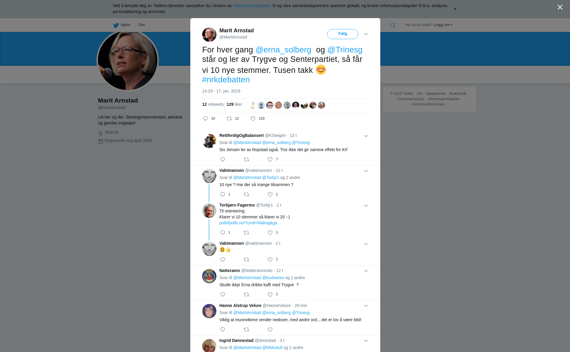 For hver gang @erna_solberg og @Trinesg står og ler av Trygve og Senterpartiet, så får vi 10 nye stemmer. Tusen takk 😊#nrkdebatten