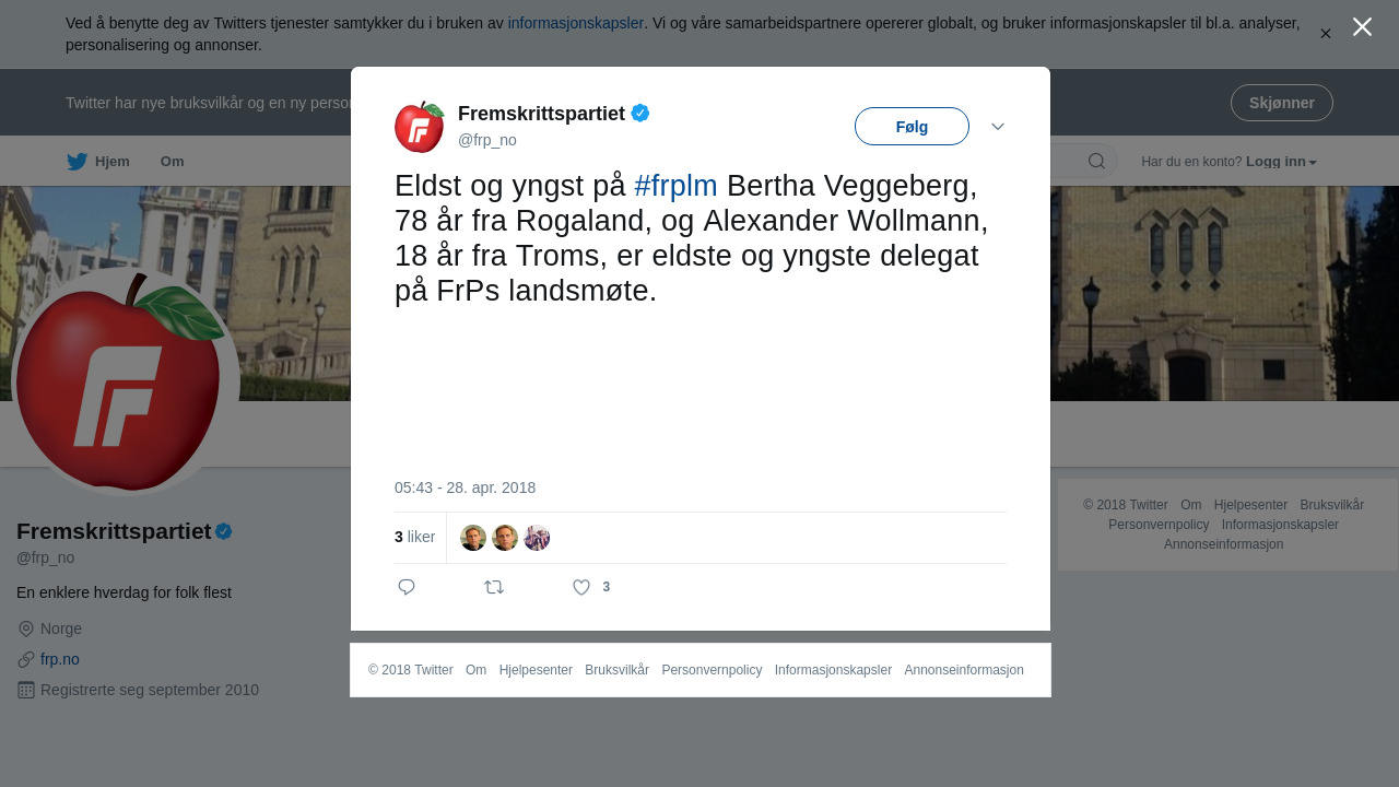 Eldst og yngst på #frplm Bertha Veggeberg, 78 år fra Rogaland, og Alexander Wollmann, 18 år fra Troms, er eldste og yngste delegat på FrPs landsmøte. https://t.co/kLd5HshuxG