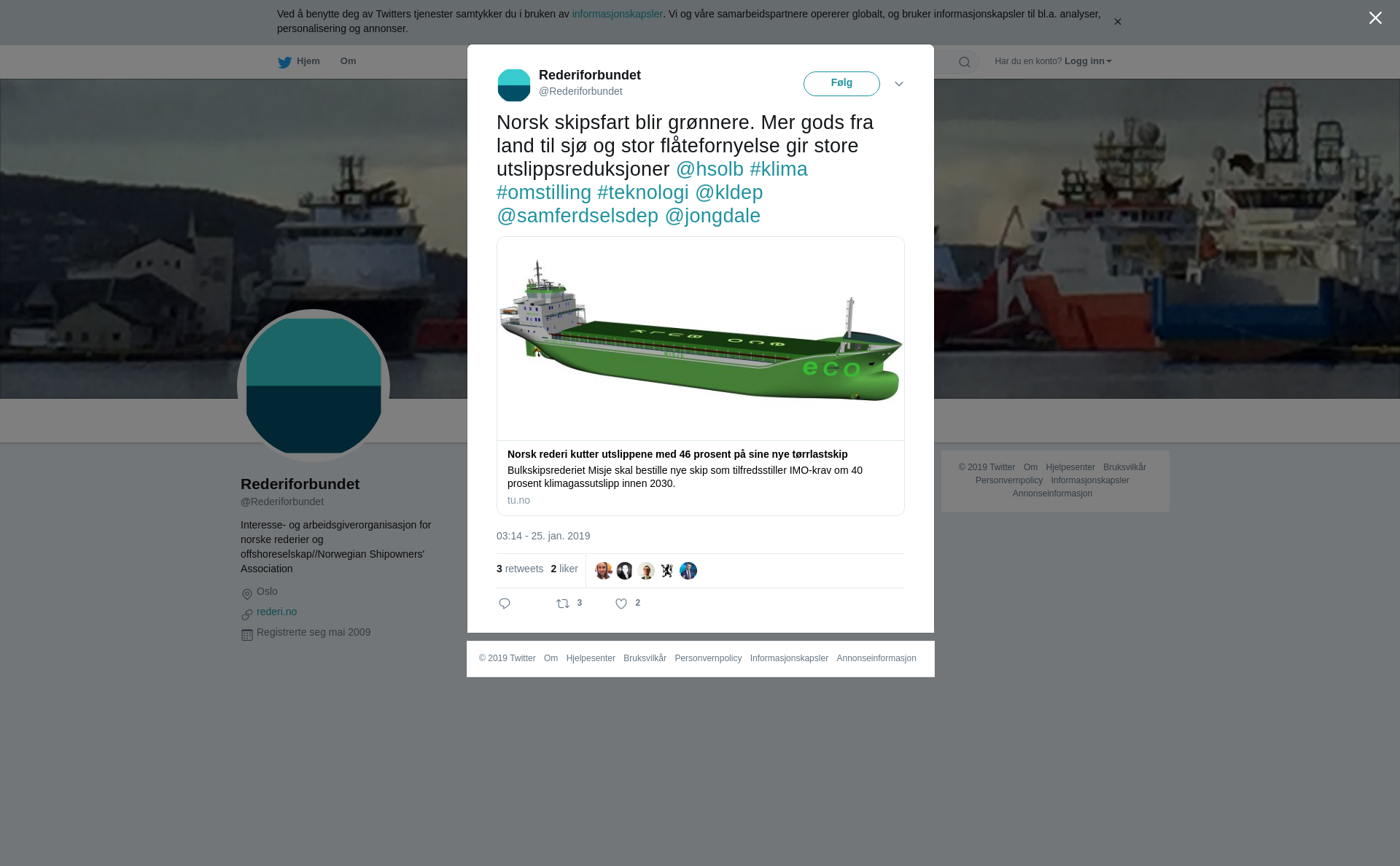 RT @Rederiforbundet: Norsk skipsfart blir grønnere. Mer gods fra land til sjø og stor flåtefornyelse gir store utslippsreduksjoner @hsolb #klima #omstilling #teknologi @kldep @samferdselsdep @jongdale https://t.co/NnBMujy7aV