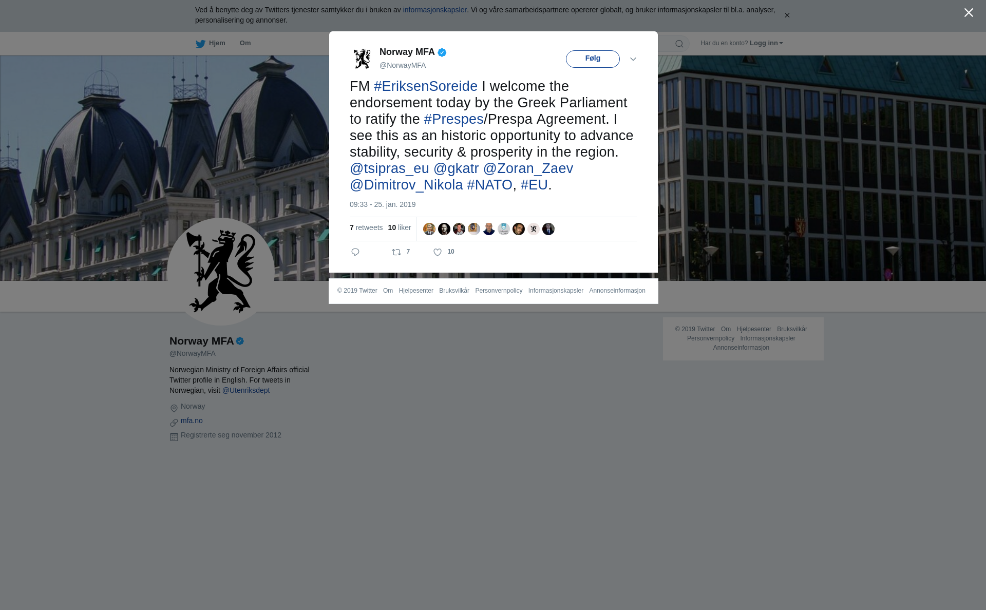 FM #EriksenSoreide I welcome the endorsement today by the Greek Parliament to ratify the #Prespes/Prespa Agreement. I see this as an historic opportunity to advance stability, security & prosperity in the region.