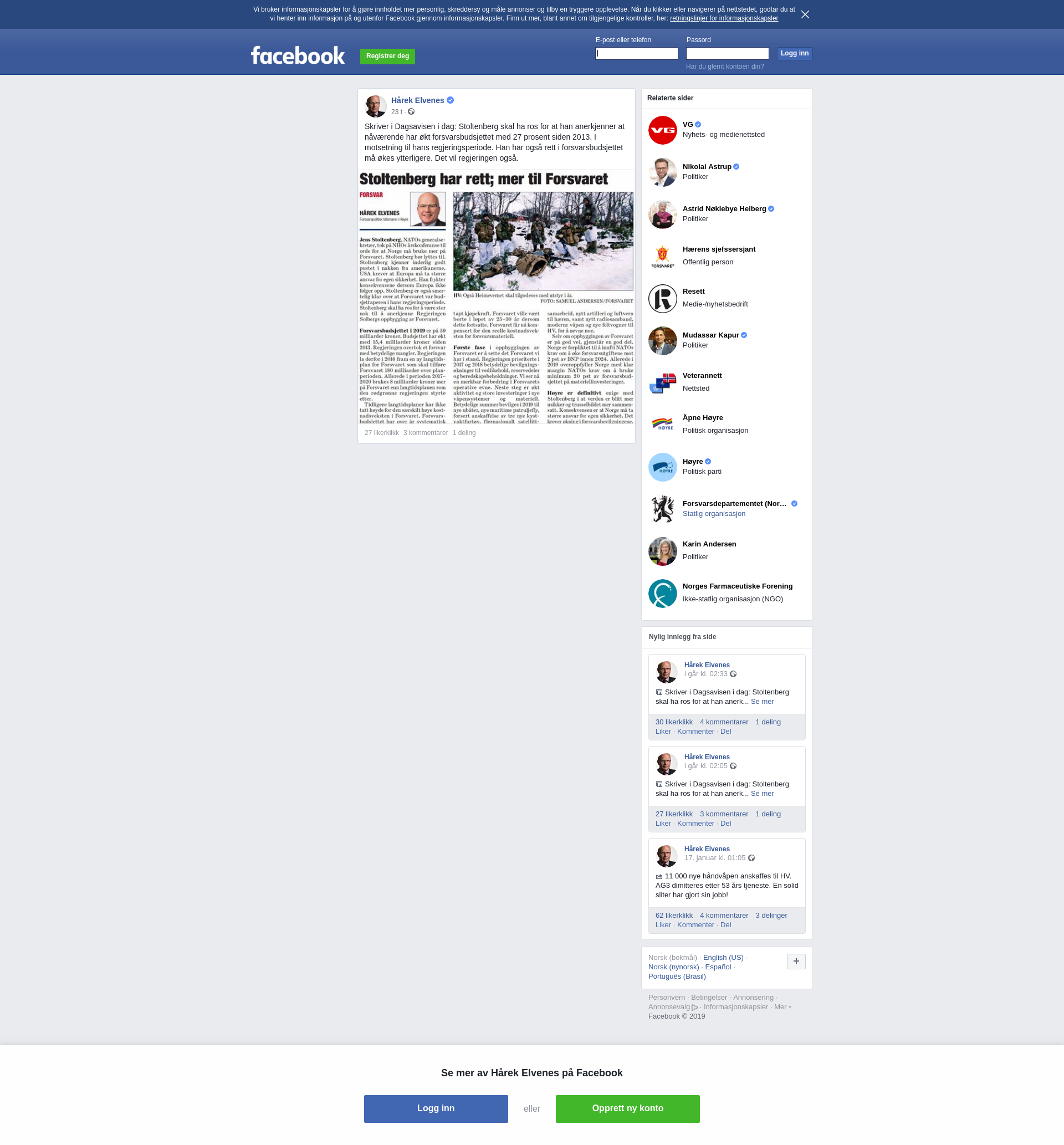 Skriver i Dagsavisen i dag: Stoltenberg skal ha ros for at han anerkjenner at nåværende har økt forsvarsbudsjettet med 27 prosent siden 2013. I motsetning til hans regjeringsperiode. Han har også rett i forsvarsbudsjettet må økes ytterligere. Det vil regjeringen også.