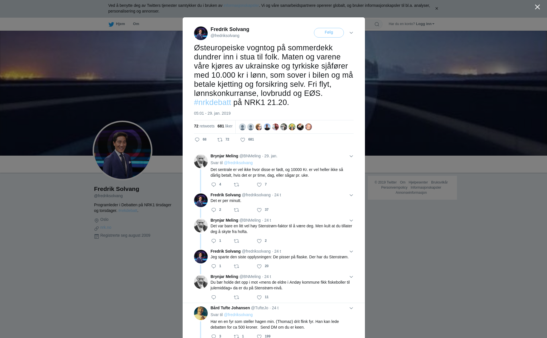 RT @fredriksolvang: Østeuropeiske vogntog på sommerdekk dundrer inn i stua til folk. Maten og varene våre kjøres av ukrainske og tyrkiske sjåfører med 10.000 kr i lønn, som sover i bilen og må betale kjetting og forsikring selv. Fri flyt, lønnskonkurranse, lovbrudd og EØS. #nrkdebatt på NRK1 21.20.