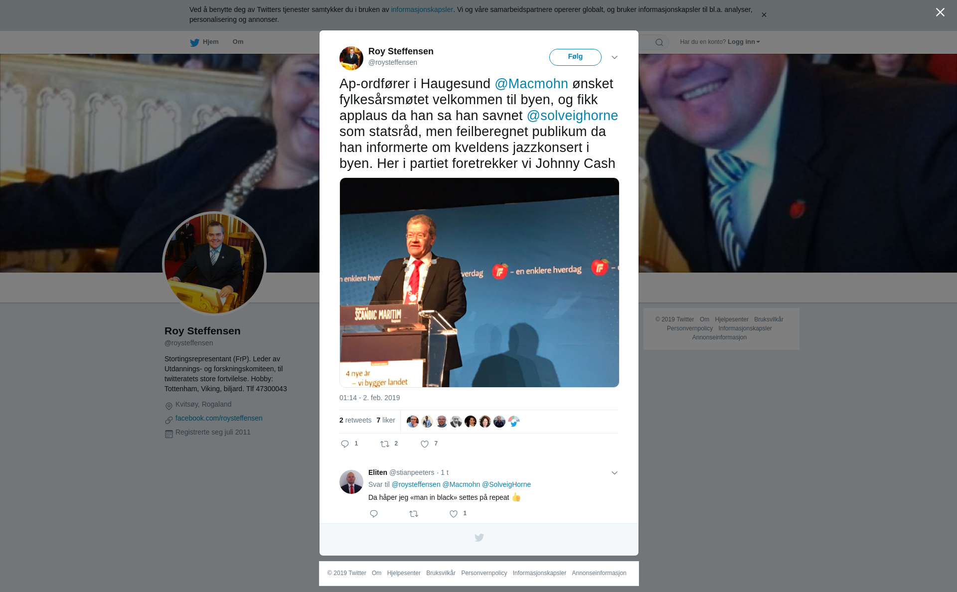 RT @roysteffensen: Ap-ordfører i Haugesund @Macmohn ønsket fylkesårsmøtet velkommen til byen, og fikk applaus da han sa han savnet @solveighorne som statsråd, men feilberegnet publikum da han informerte om kveldens jazzkonsert i byen. Her i partiet foretrekker vi Johnny Cash https://t.co/GMZPX4Fj3Z