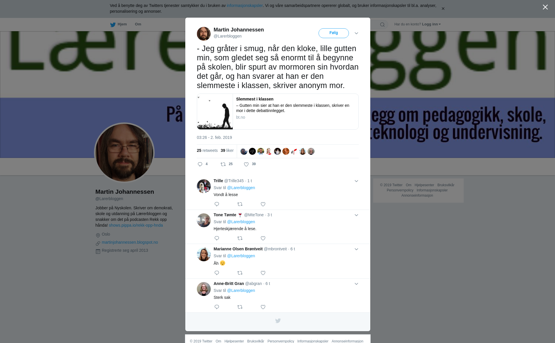 RT @Larerbloggen: - Jeg gråter i smug, når den kloke, lille gutten min, som gledet seg så enormt til å begynne på skolen, blir spurt av mormoren sin hvordan det går, og han svarer at han er den slemmeste i klassen, skriver anonym mor.