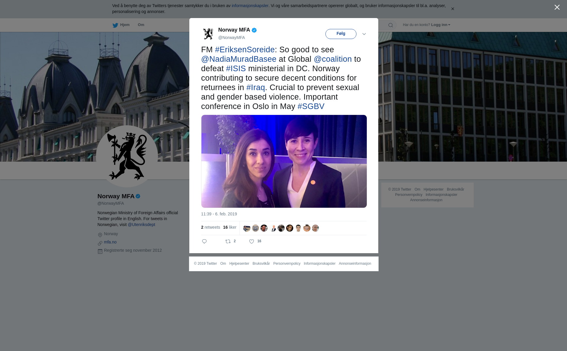 FM #EriksenSoreide: So good to see @NadiaMuradBasee at Global @coalition to defeat #ISIS ministerial in DC. Norway contributing to secure decent conditions for returnees in #Iraq. Crucial to prevent sexual and gender based violence. Important conference in Oslo in May #SGBV https://t.co/VsrMSnekks