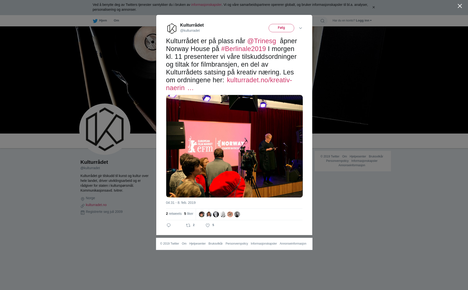 RT @kulturradet: Kulturrådet er på plass når @Trinesg åpner Norway House på #Berlinale2019 I morgen kl. 11 presenterer vi våre tilskuddsordninger og tiltak for filmbransjen, en del av Kulturrådets satsing på kreativ næring. Les om ordningene her: https://t.co/rWx3uH5S1i https://t.co/wwRk8sytzr
