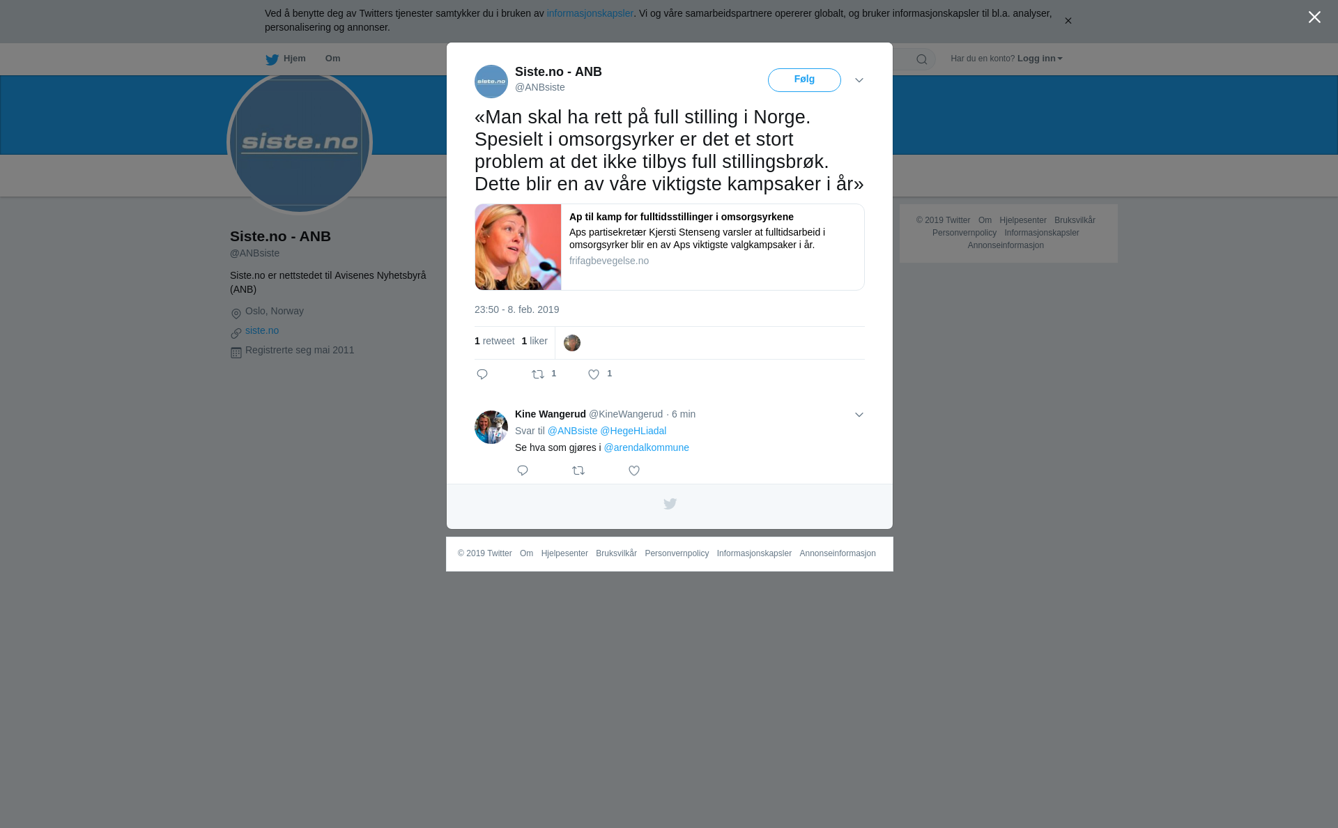 RT @ANBsiste: «Man skal ha rett på full stilling i Norge. Spesielt i omsorgsyrker er det et stort problem at det ikke tilbys full stillingsbrøk. Dette blir en av våre viktigste kampsaker i år» https://t.co/H3ctiyV1yH