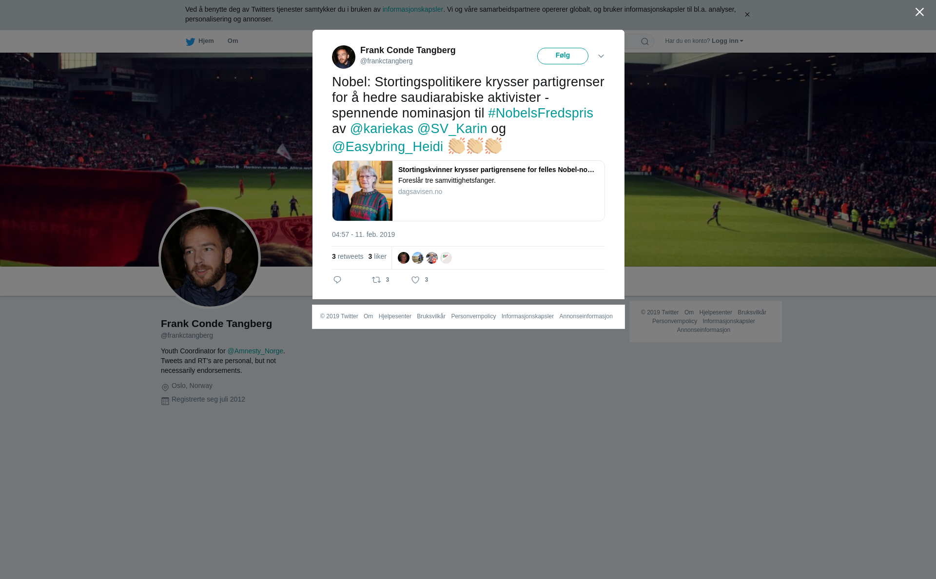 RT @frankctangberg: Nobel: Stortingspolitikere krysser partigrenser for å hedre saudiarabiske aktivister - spennende nominasjon til #NobelsFredspris av @kariekas @SV_Karin og @Easybring_Heidi 👏🏼👏🏼👏🏼 https://t.co/UPrl1oskvH
