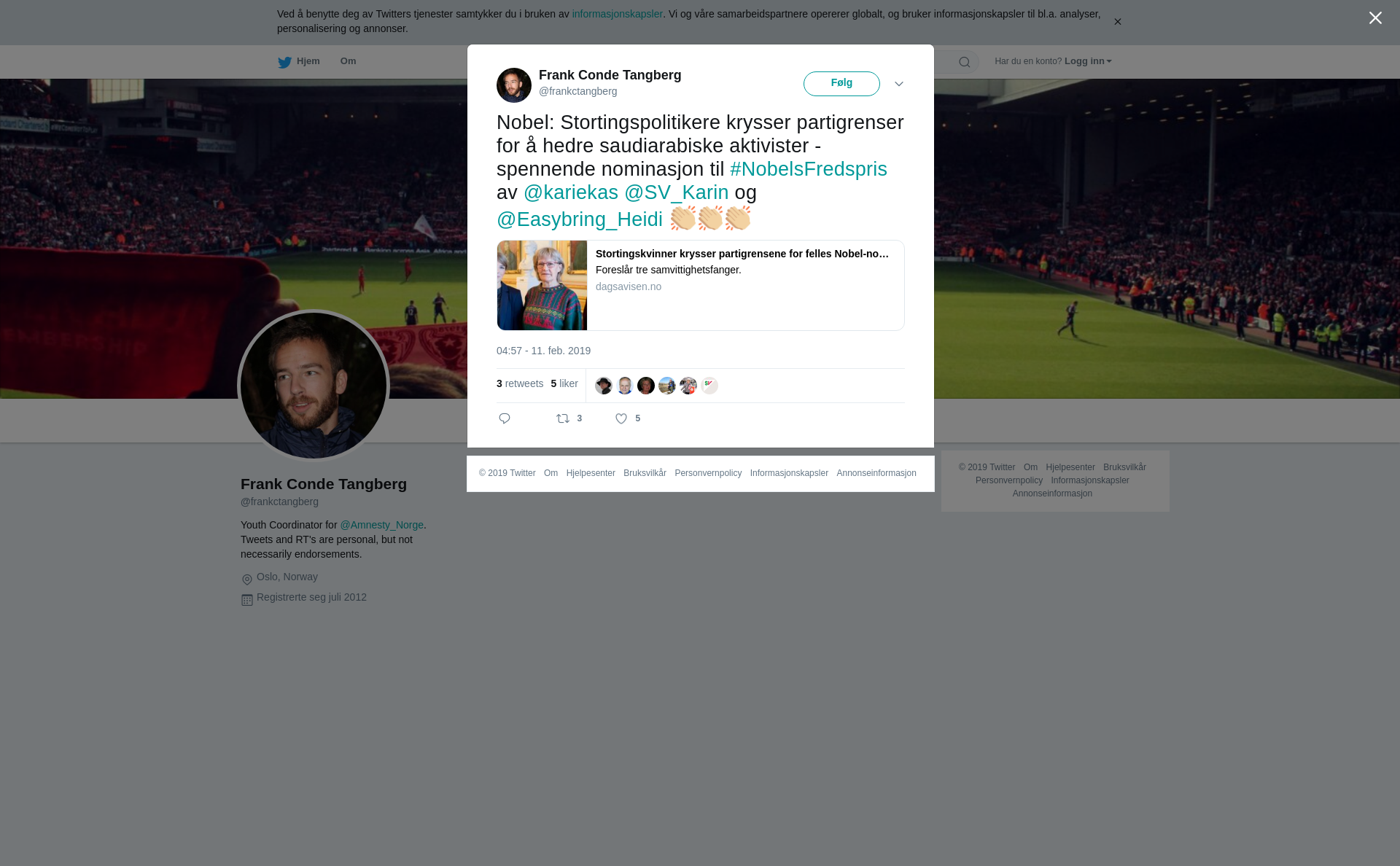 RT @frankctangberg: Nobel: Stortingspolitikere krysser partigrenser for å hedre saudiarabiske aktivister - spennende nominasjon til #NobelsFredspris av @kariekas @SV_Karin og @Easybring_Heidi 👏🏼👏🏼👏🏼 https://t.co/UPrl1oskvH