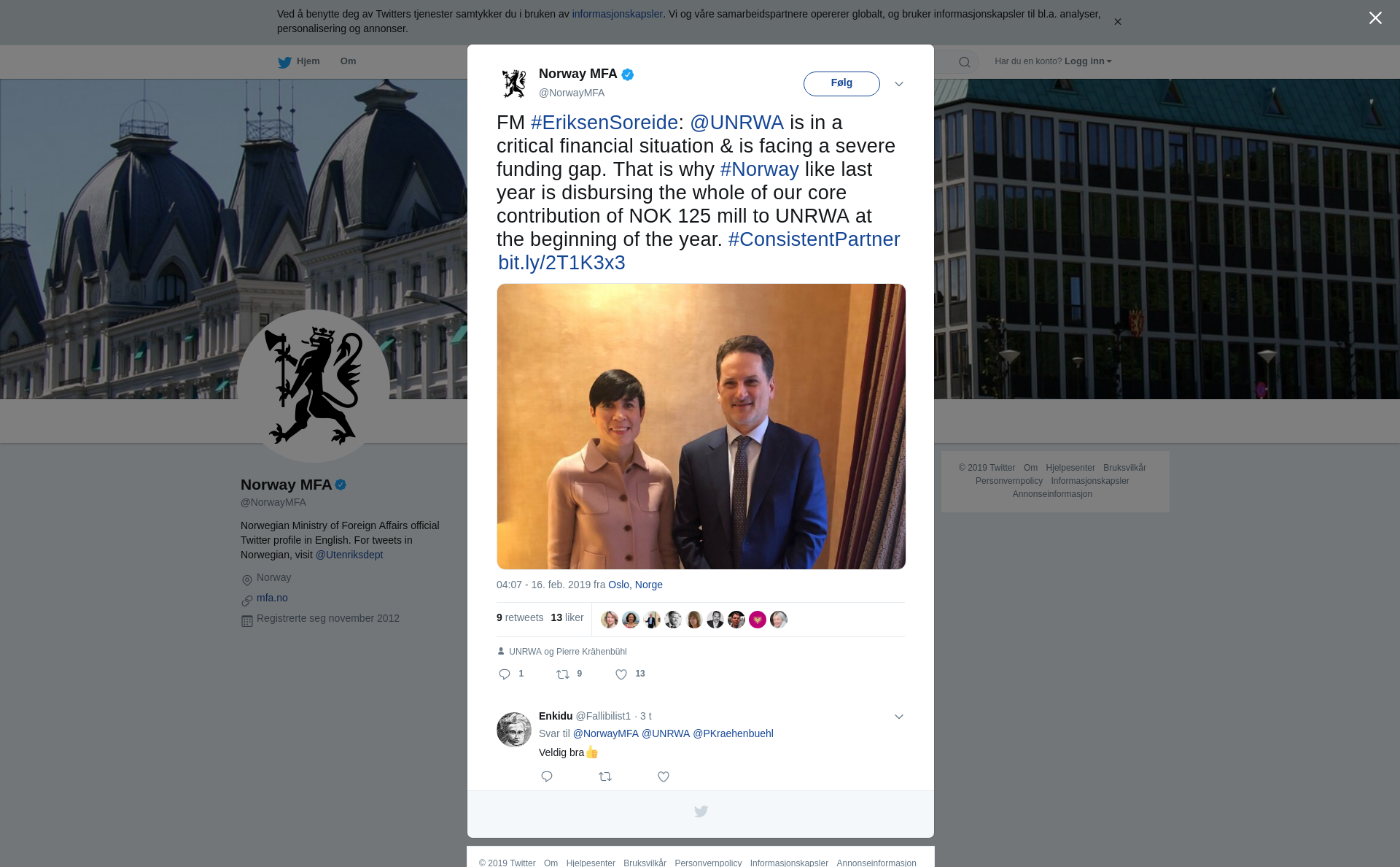 ‘The UN Relief and Works Agency for Palestine Refugees (UNRWA) is in a critical financial situation and is facing a severe funding gap. That is why we like last year are disbursing the whole of our core contribution of NOK 125 million to UNRWA at the b...