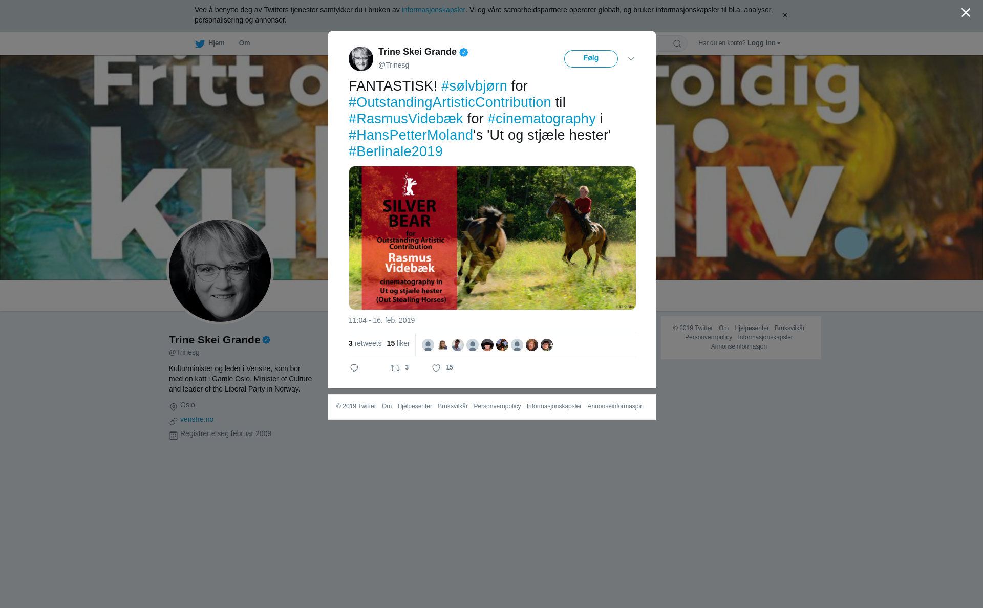 FANTASTISK! #sølvbjørn for #OutstandingArtisticContribution til #RasmusVidebæk for #cinematography i #HansPetterMoland's 'Ut og stjæle hester' #Berlinale2019 https://t.co/MV8pCtYHs9