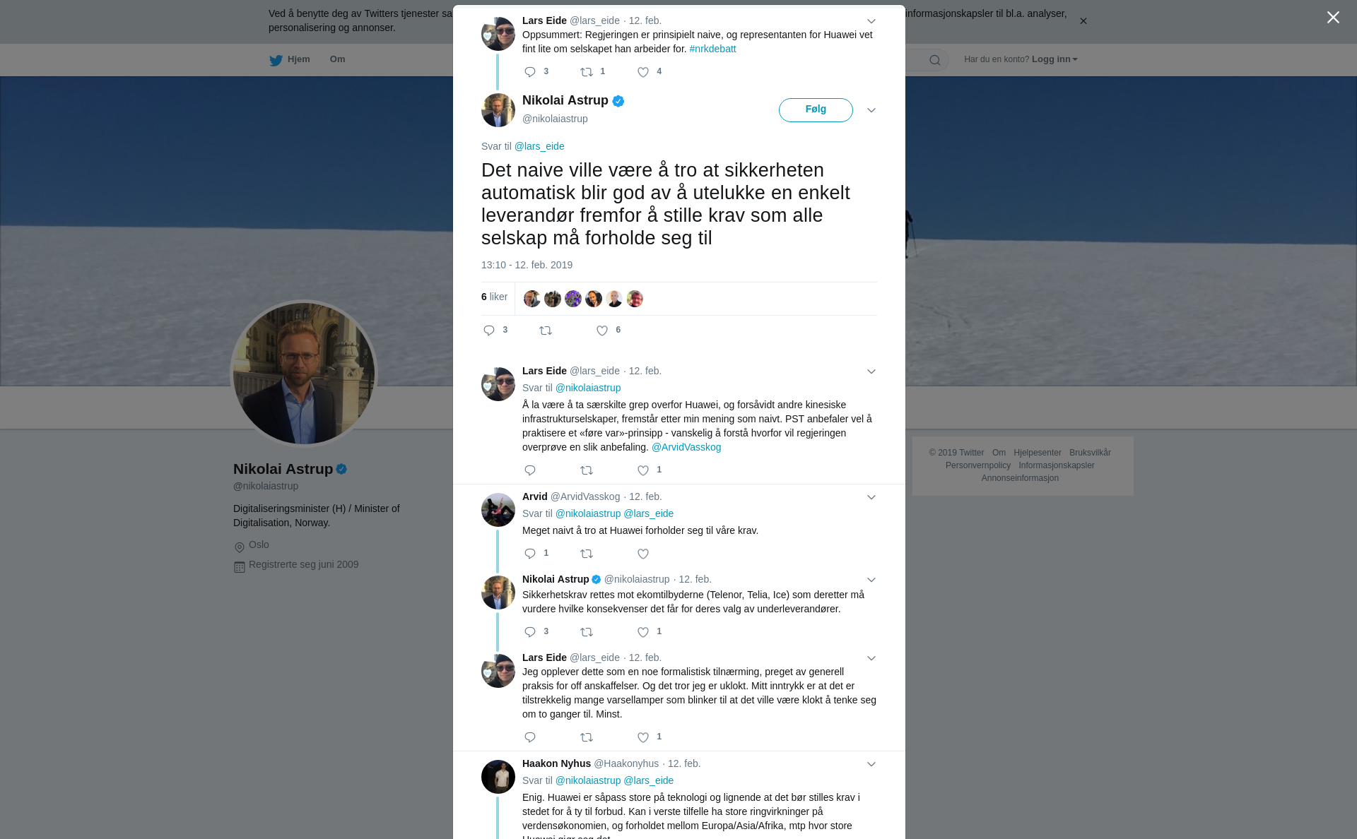 @lars_eide Det naive ville være å tro at sikkerheten automatisk blir god av å utelukke en enkelt leverandør fremfor å stille krav som alle selskap må forholde seg til