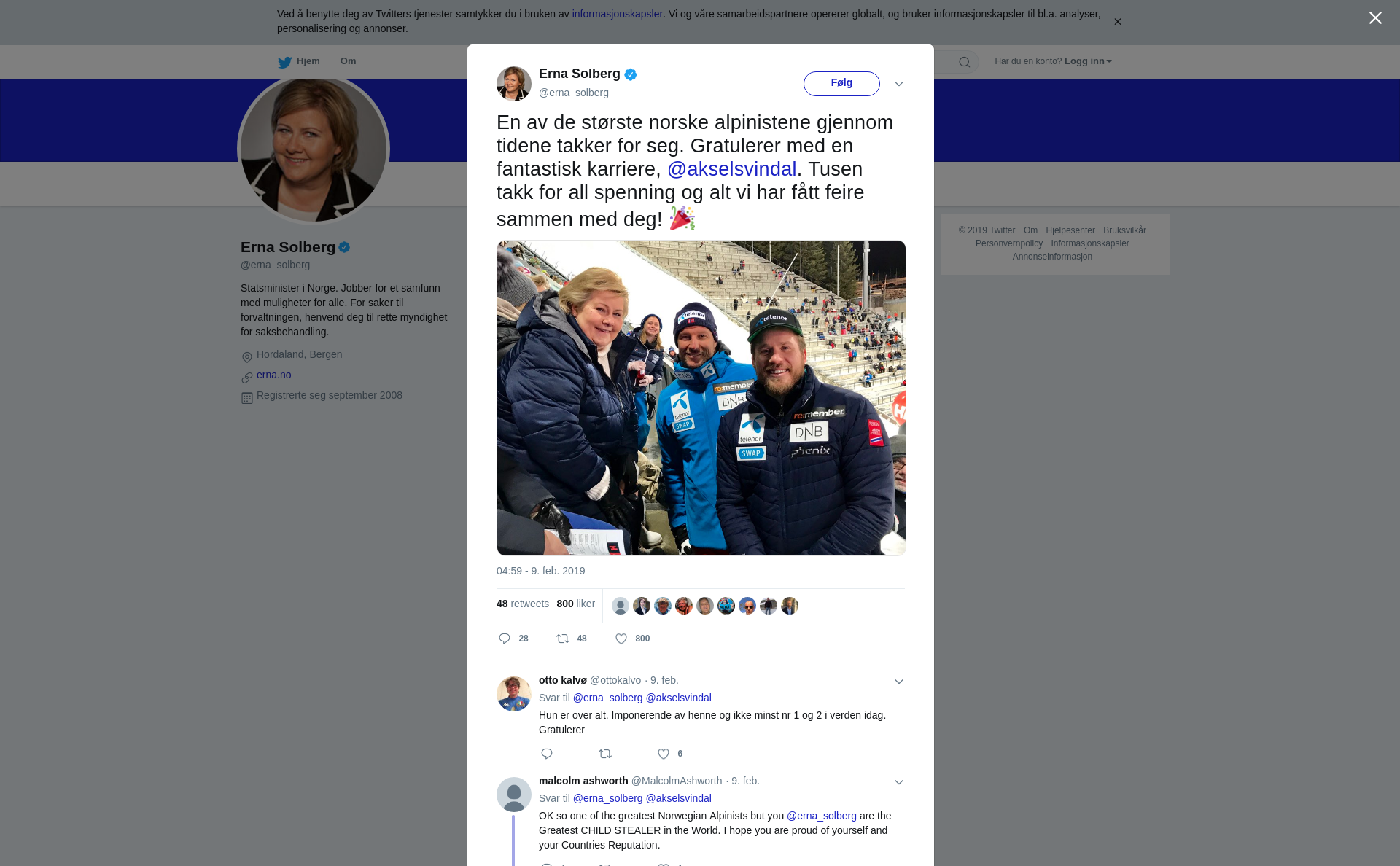 RT @erna_solberg: En av de største norske alpinistene gjennom tidene takker for seg. Gratulerer med en fantastisk karriere, @akselsvindal. Tusen takk for all spenning og alt vi har fått feire sammen med deg! 🎉 https://t.co/BaFihXIwnc