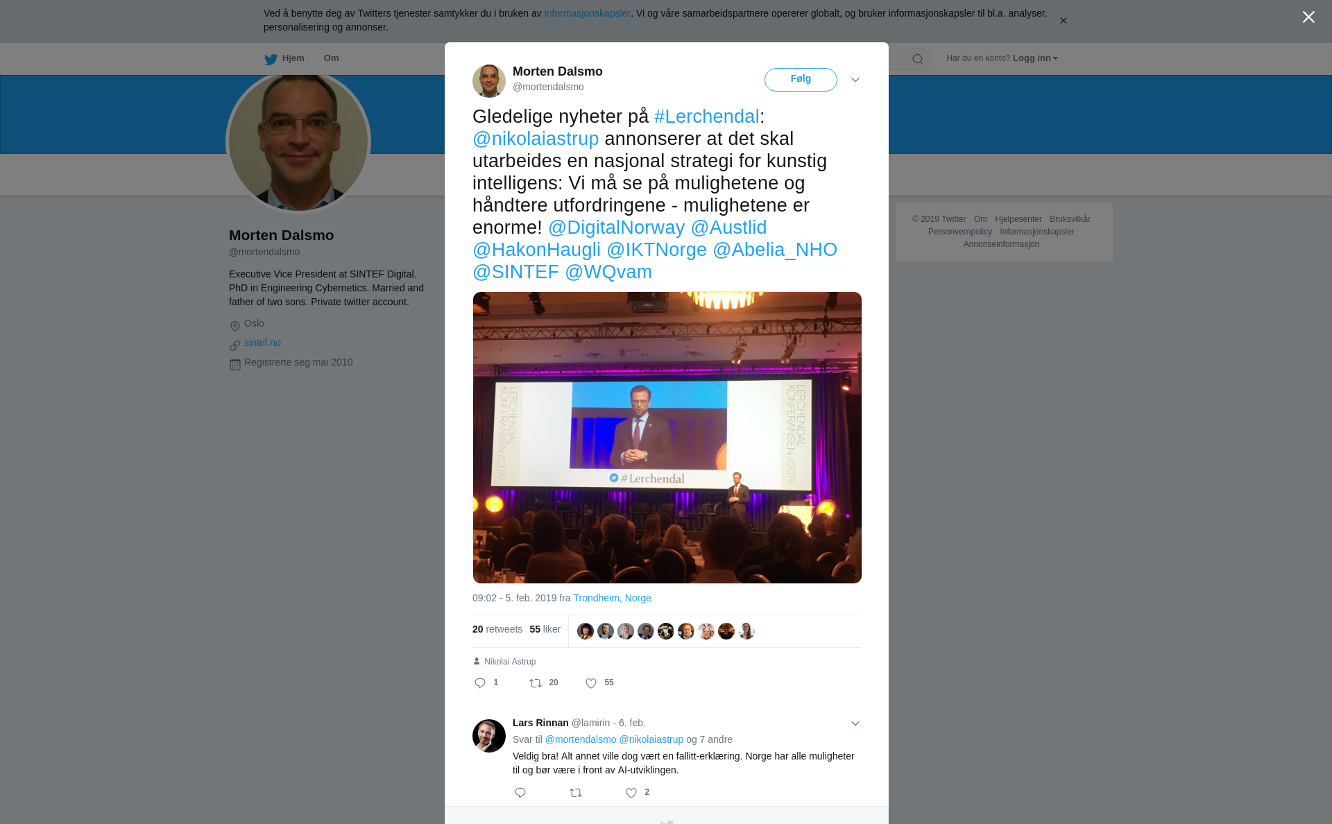 RT @mortendalsmo: Gledelige nyheter på #Lerchendal: @nikolaiastrup annonserer at det skal utarbeides en nasjonal strategi for kunstig intelligens: Vi må se på mulighetene og håndtere utfordringene - mulighetene er enorme! @DigitalNorway @Austlid @HakonHaugli @IKTNorge @Abelia_NHO @SINTEF @WQvam https://t.co/AB5e4abHB7