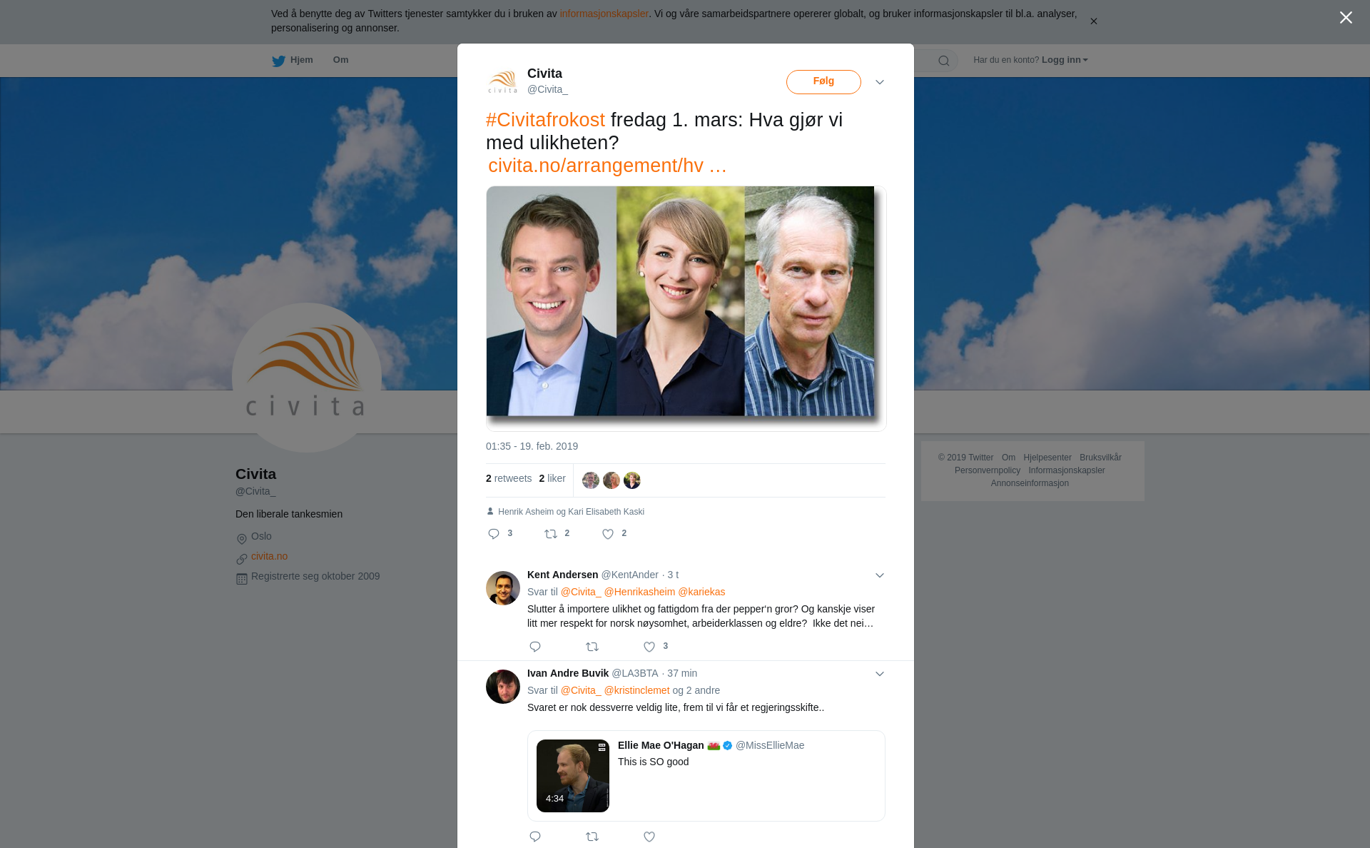 Civitafrokost fredag 1. mars. I panelet: Henrik Asheim, stortingsrepresentant for Høyre og leder av Stortingets finanskomité, Kari Elisabeth Kaski, stortingsrepresentant og finanspolitisk talsperson for SV og Roar Hagen, dr. philos og professor ved Institutt for sosiologi ved Universitetet i Tromsø.