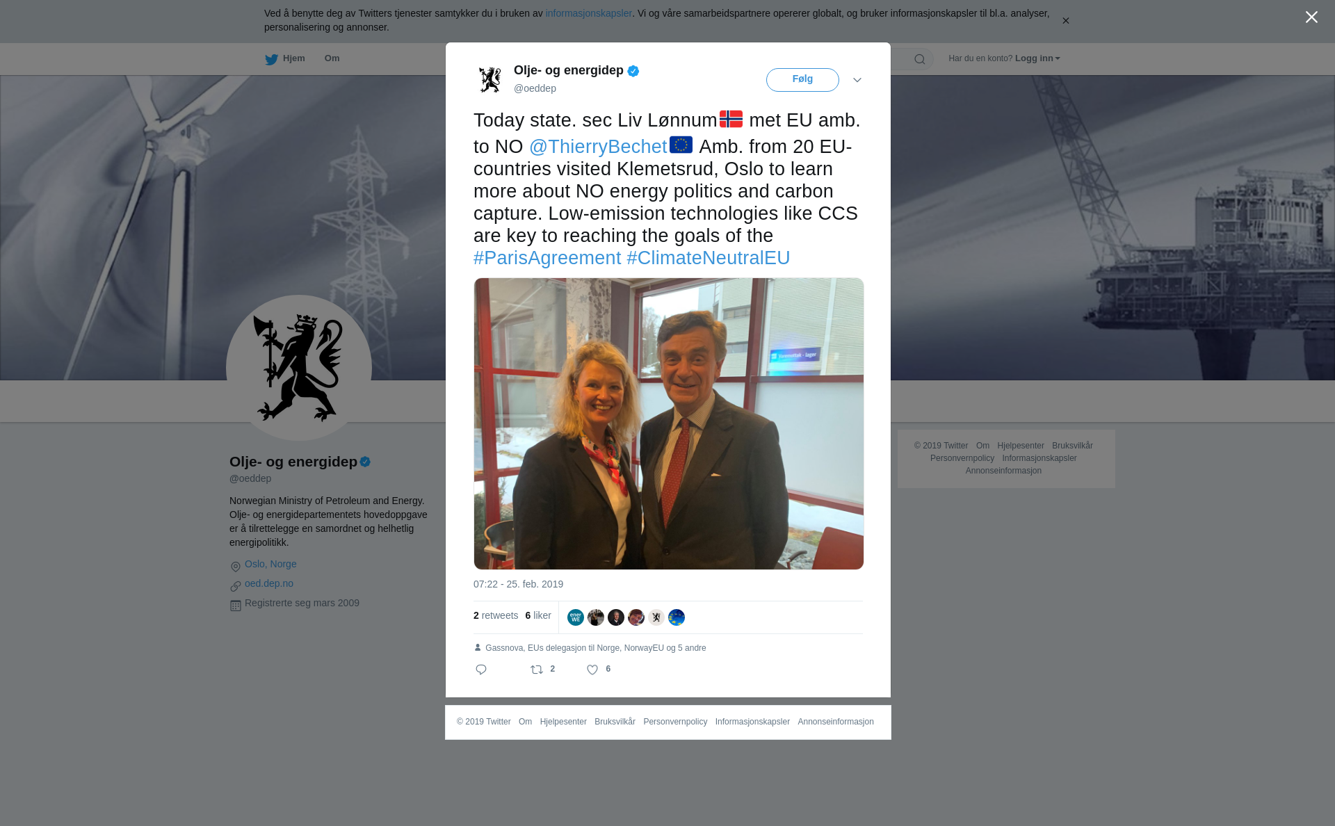 Today state. sec Liv Lønnum🇳🇴 met EU amb. to NO @ThierryBechet🇪🇺 Amb. from 20 EU-countries visited Klemetsrud, Oslo to learn more about NO energy politics and carbon capture. Low-emission technologies like CCS are key to reaching the goals of the #ParisAgreement #ClimateNeutralEU https://t.co/bqzqAOjwUe