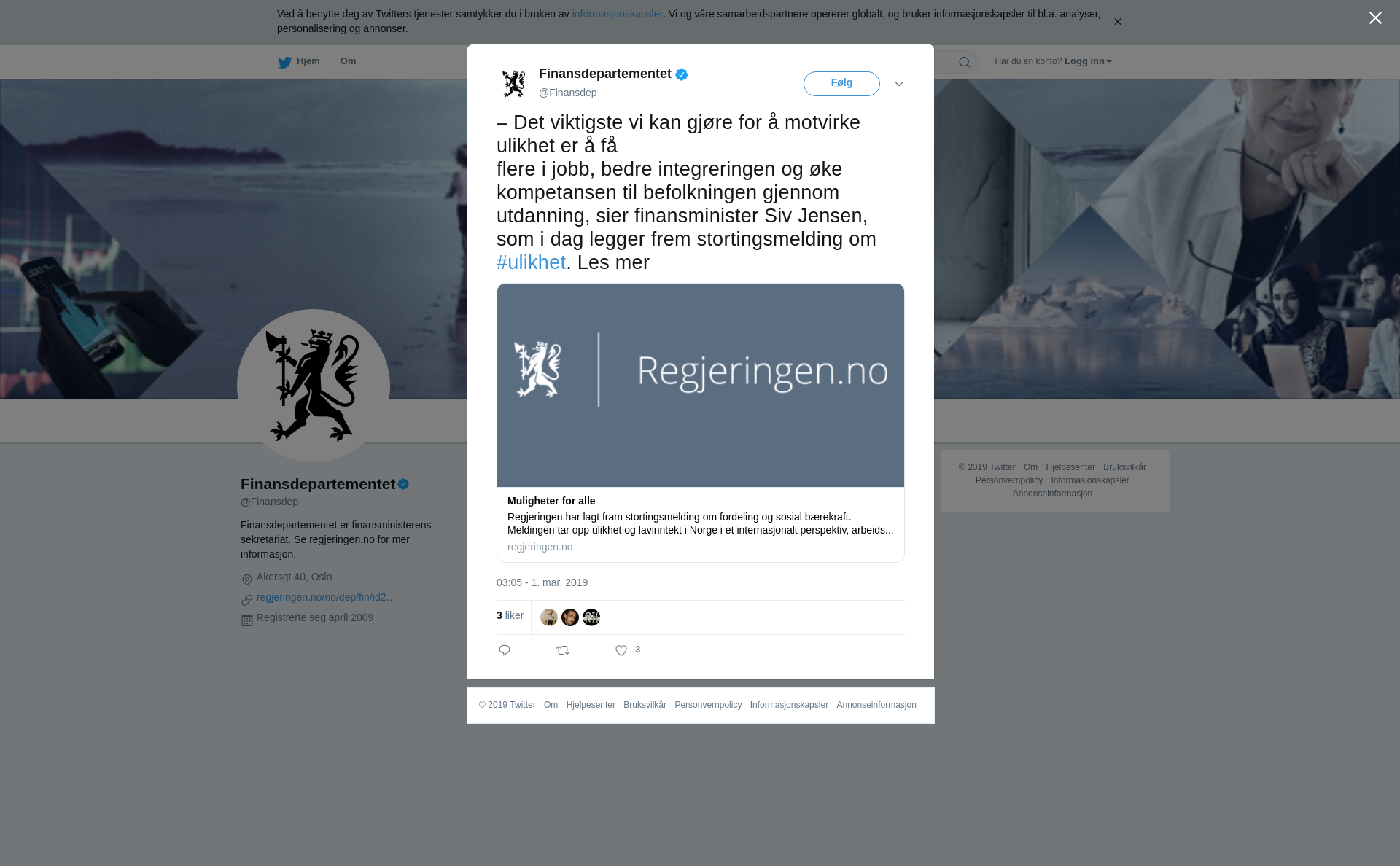 utdanning, sier finansminister Siv Jensen, som i dag legger frem stortingsmelding om #ulikhet. Les mer https://t.co/WLo8nKxs5o