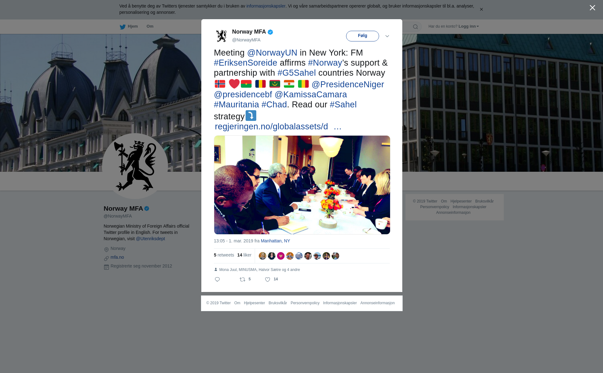 Meeting @NorwayUN in New York: FM #EriksenSoreide affirms #Norway’s support & partnership with #G5Sahel countries Norway 🇳🇴 ❤️🇧🇫 🇹🇩 🇲🇷 🇳🇪 🇲🇱 @PresidenceNiger @presidencebf @KamissaCamara #Mauritania #Chad. Read our #Sahel strategy⤵️ https://t.co/dFgNsBX2rP https://t.co/mQMRhx4mQG