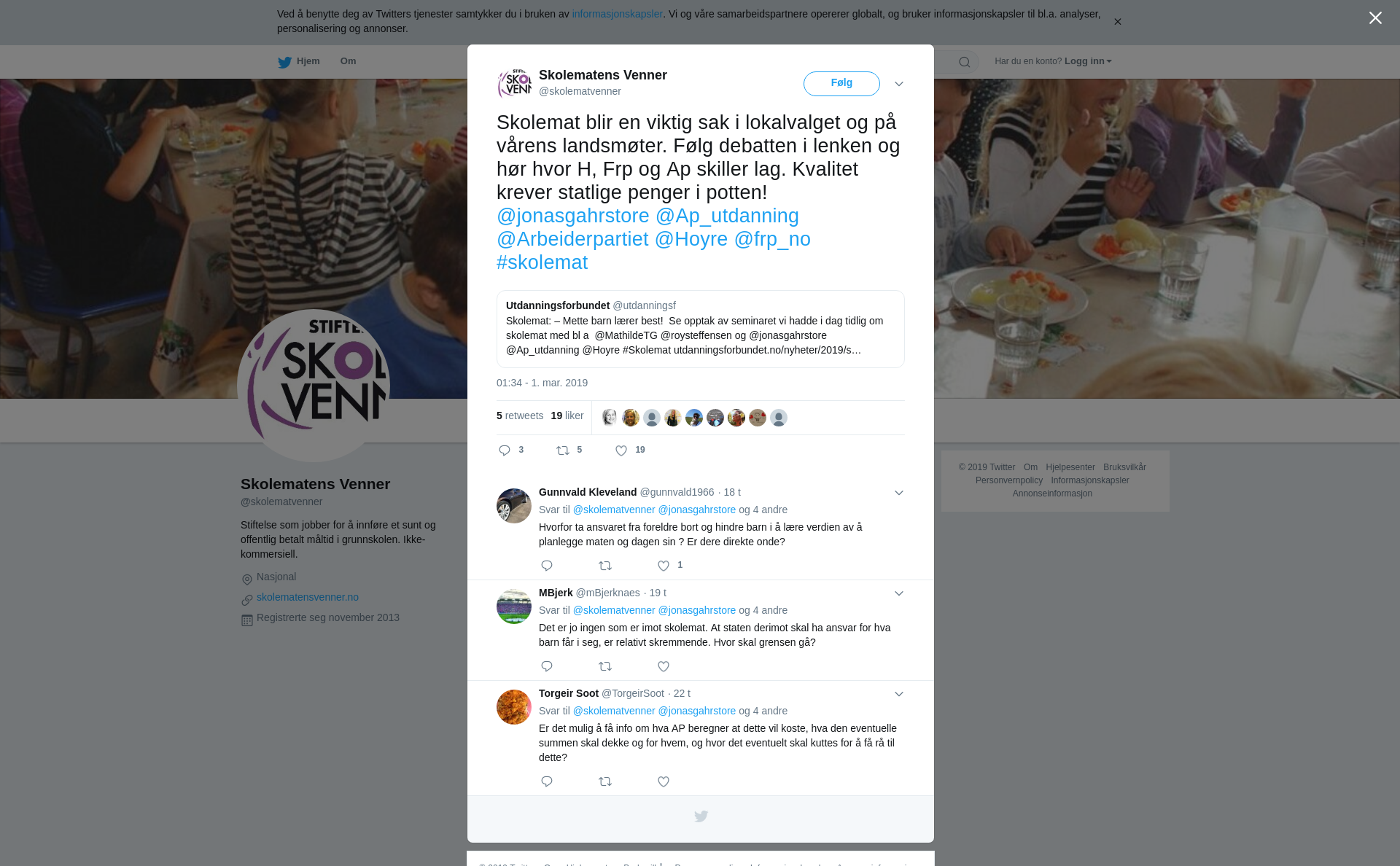 RT @skolematvenner: Skolemat blir en viktig sak i lokalvalget og på vårens landsmøter. Følg debatten i lenken og hør hvor H, Frp og Ap skiller lag. Kvalitet krever statlige penger i potten! @jonasgahrstore @Ap_utdanning @Arbeiderpartiet @Hoyre @frp_no #skolemat https://t.co/NmZYjWlWmT