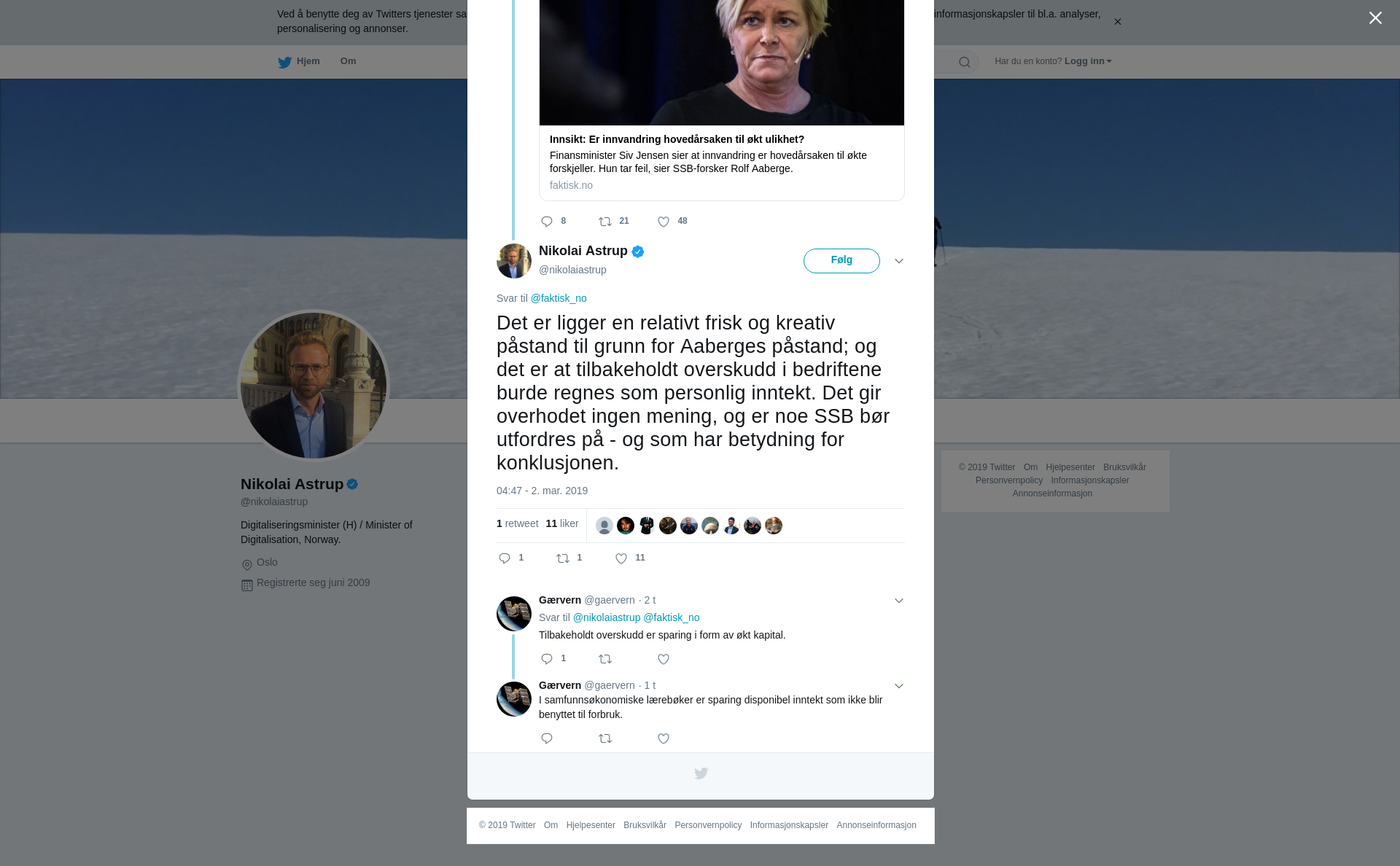 @faktisk_no Det er ligger en relativt frisk og kreativ påstand til grunn for Aaberges påstand; og det er at tilbakeholdt overskudd i bedriftene burde regnes som personlig inntekt. Det gir overhodet ingen mening, og er noe SSB bør utfordres på - og som har betydning for konklusjonen.