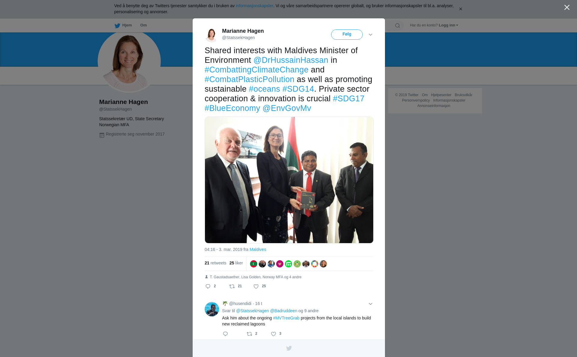 RT @StatssekHagen: Shared interests with Maldives Minister of Environment @DrHussainHassan in #CombattingClimateChange and #CombatPlasticPollution as well as promoting sustainable #oceans #SDG14. Private sector cooperation & innovation is crucial #SDG17 #BlueEconomy @EnvGovMv https://t.co/2MZBazvbEo