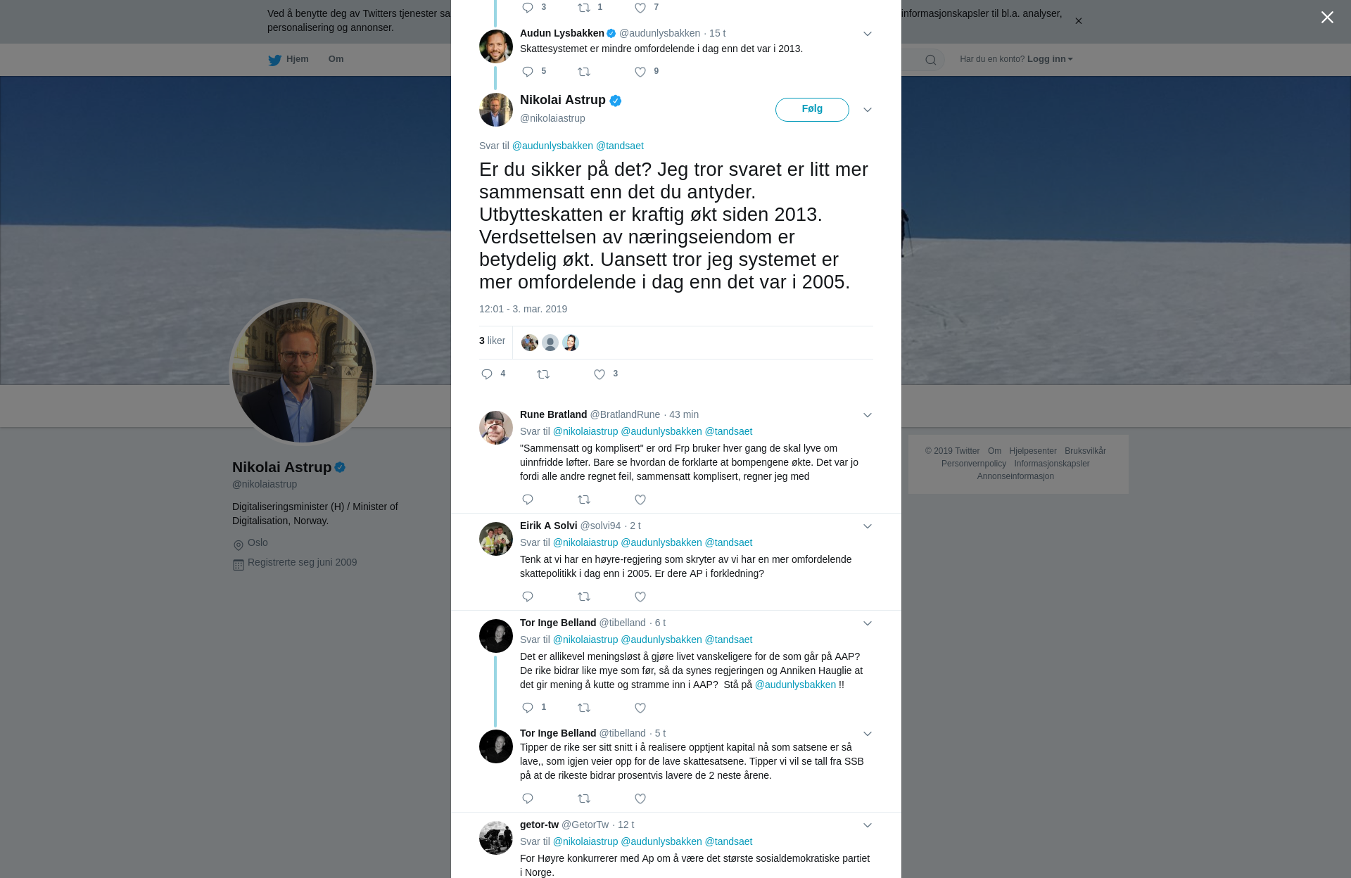@audunlysbakken @tandsaet Er du sikker på det? Jeg tror svaret er litt mer sammensatt enn det du antyder. Utbytteskatten er kraftig økt siden 2013. Verdsettelsen av næringseiendom er betydelig økt. Uansett tror jeg systemet er mer omfordelende i dag enn det var i 2005.