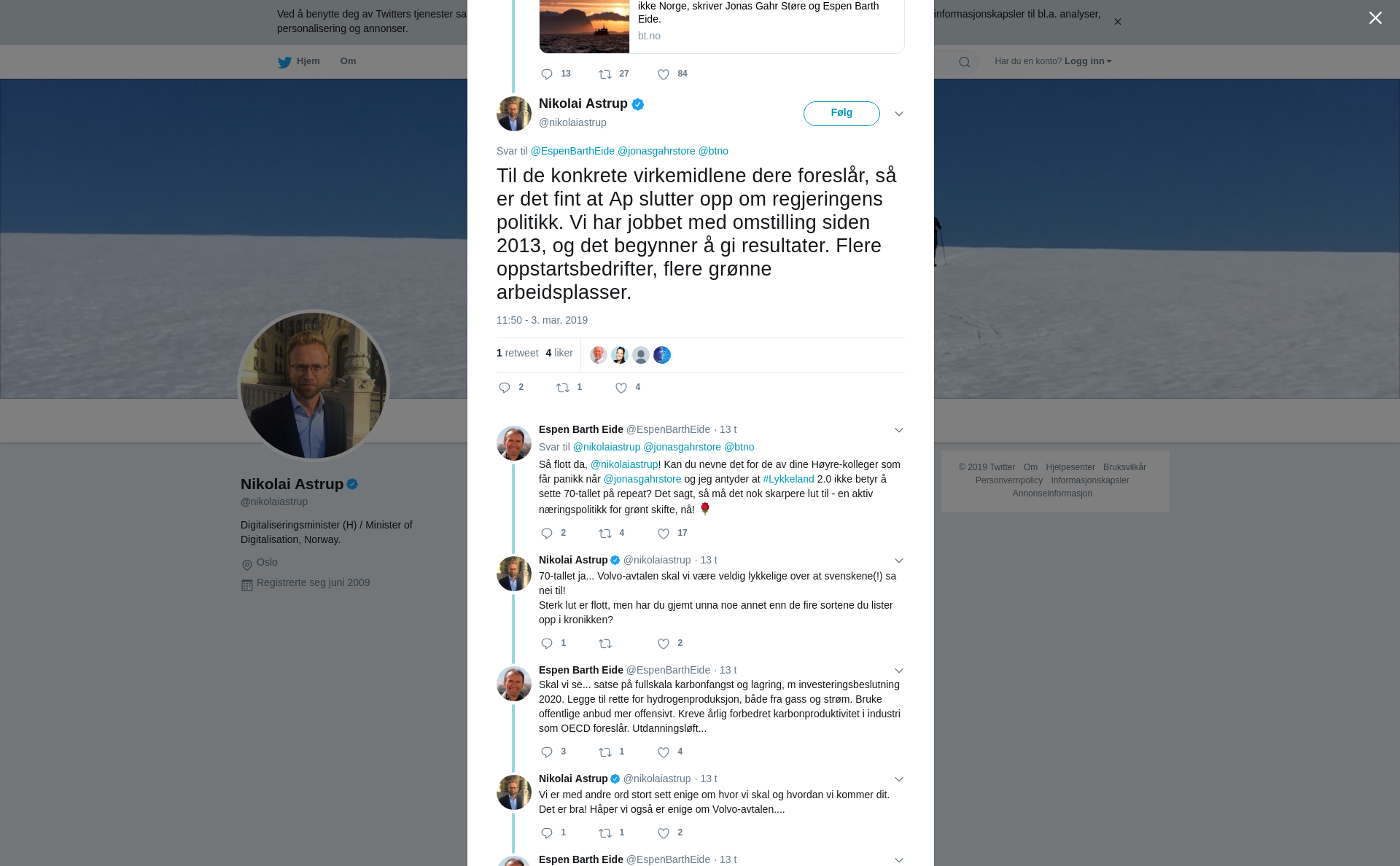@EspenBarthEide @jonasgahrstore @btno Til de konkrete virkemidlene dere foreslår, så er det fint at Ap slutter opp om regjeringens politikk. Vi har jobbet med omstilling siden 2013, og det begynner å gi resultater. Flere oppstartsbedrifter, flere grønne arbeidsplasser.