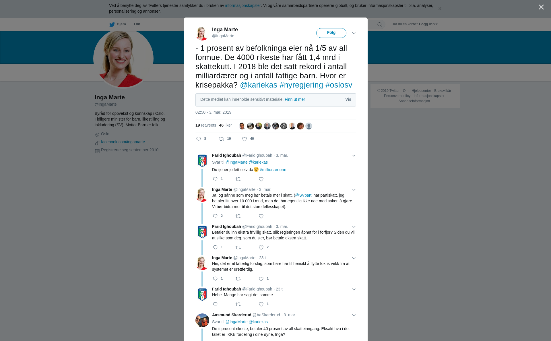 RT @IngaMarte: - 1 prosent av befolkninga eier nå 1/5 av all formue. De 4000 rikeste har fått 1,4 mrd i skattekutt. I 2018 ble det satt rekord i antall milliardærer og i antall fattige barn. Hvor er krisepakka? @kariekas #nyregjering #oslosv https://t.co/vq3r5Sq29I