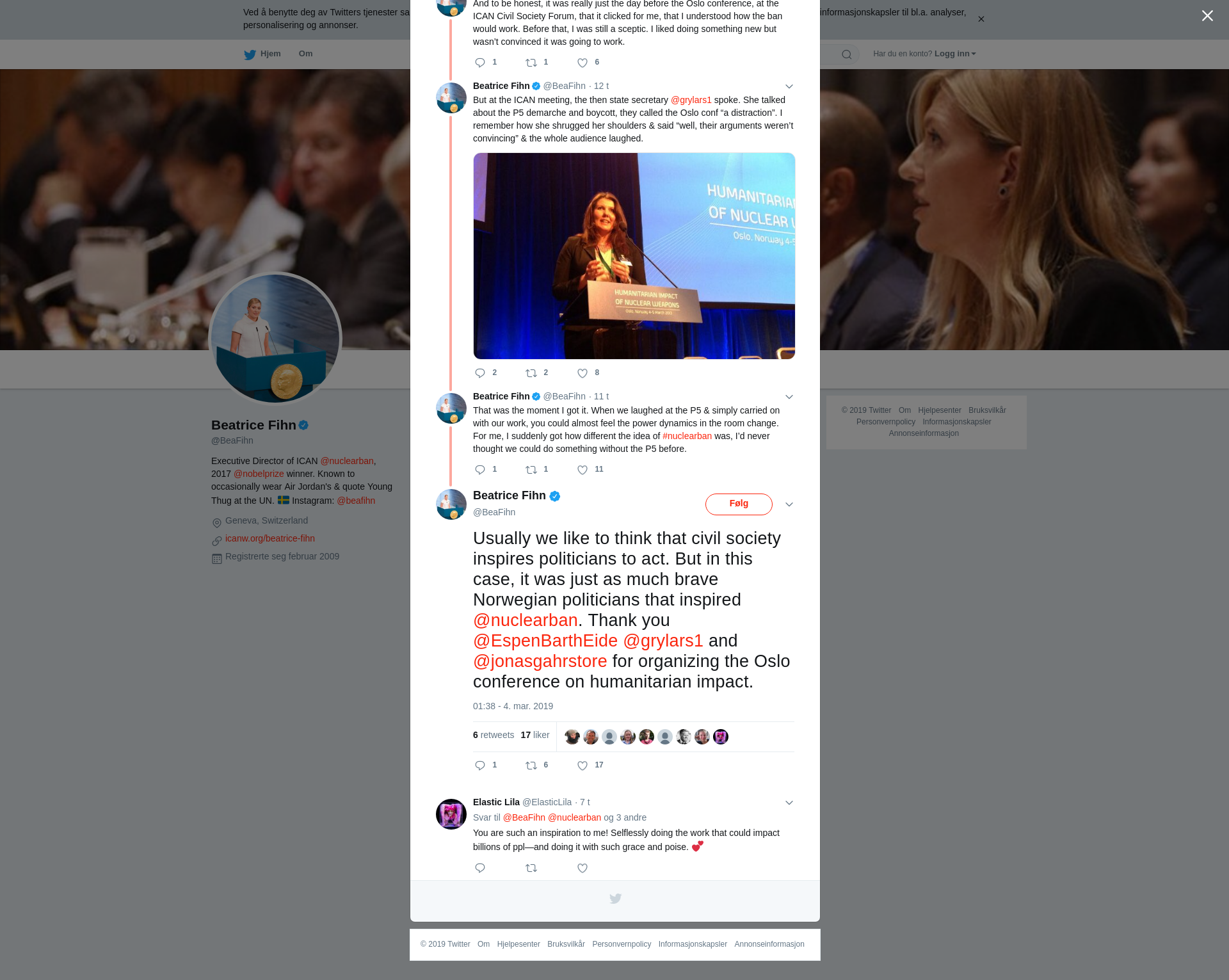 RT @BeaFihn: Usually we like to think that civil society inspires politicians to act. But in this case, it was just as much brave Norwegian politicians that inspired @nuclearban. Thank you @EspenBarthEide @grylars1 and @jonasgahrstore for organizing the Oslo conference on humanitarian impact.