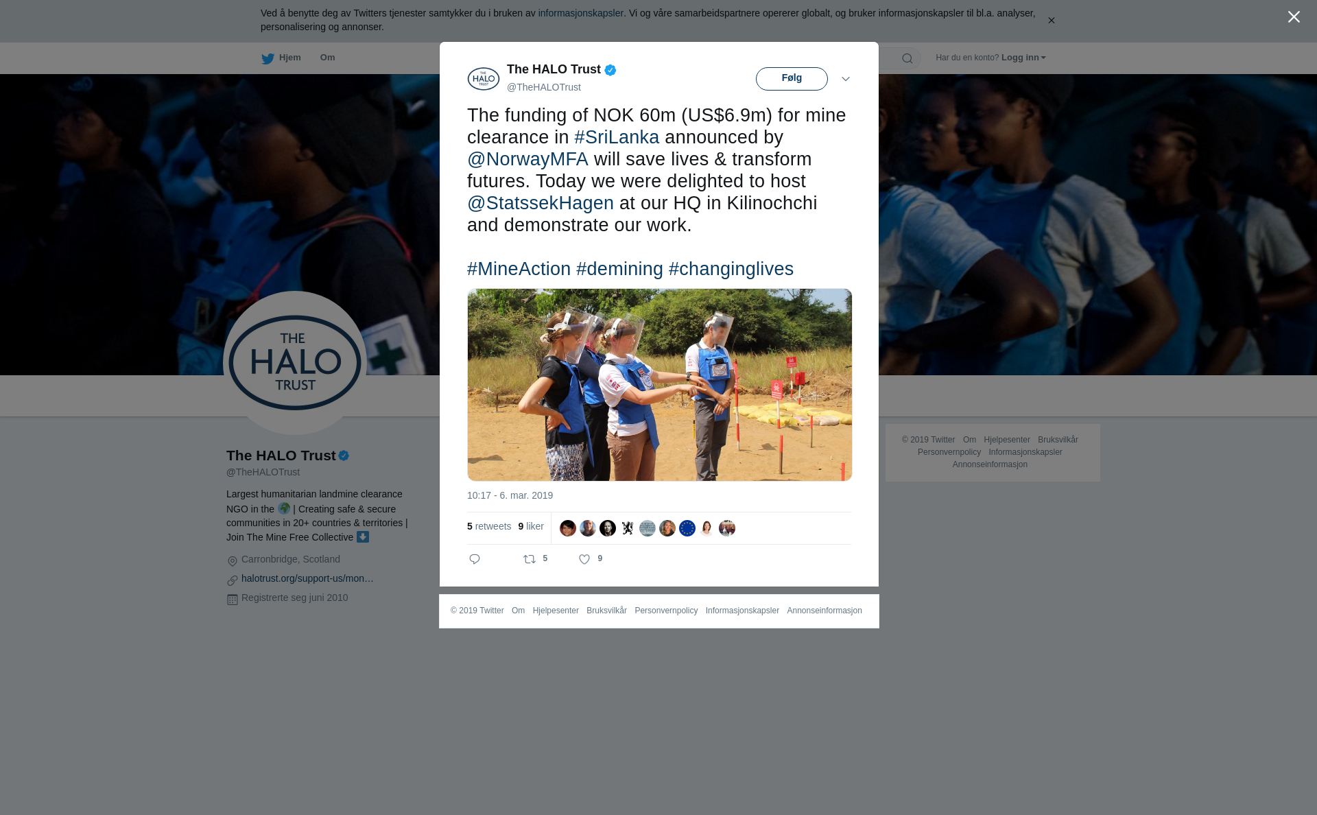 RT @TheHALOTrust: The funding of NOK 60m (US$6.9m) for mine clearance in #SriLanka announced by @NorwayMFA will save lives & transform futures. Today we were delighted to host @StatssekHagen at our HQ in Kilinochchi and demonstrate our work.