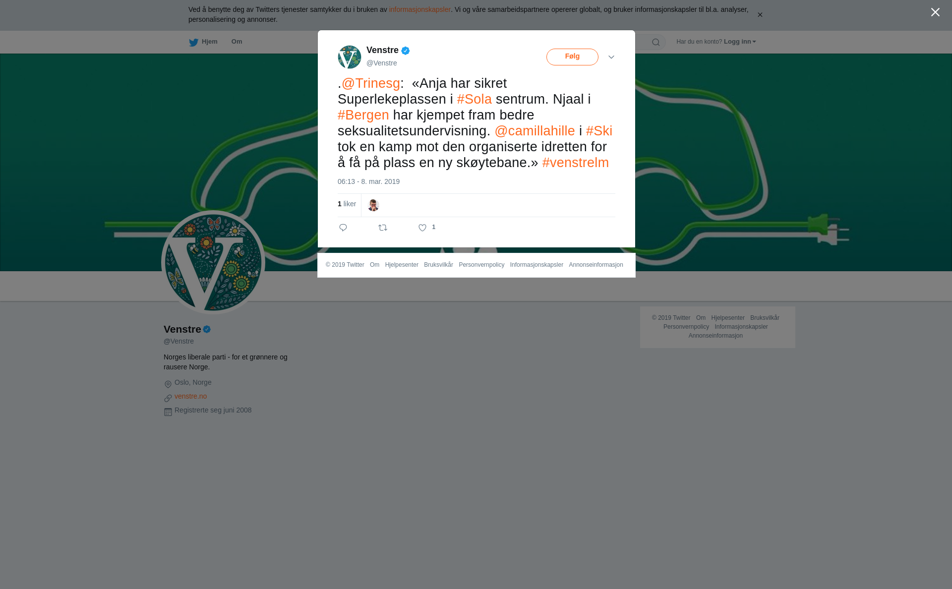 .@Trinesg: «Anja har sikret Superlekeplassen i #Sola sentrum. Njaal i #Bergen har kjempet fram bedre seksualitetsundervisning. @camillahille i #Ski tok en kamp mot den organiserte idretten for å få på plass en ny skøytebane.» #venstrelm