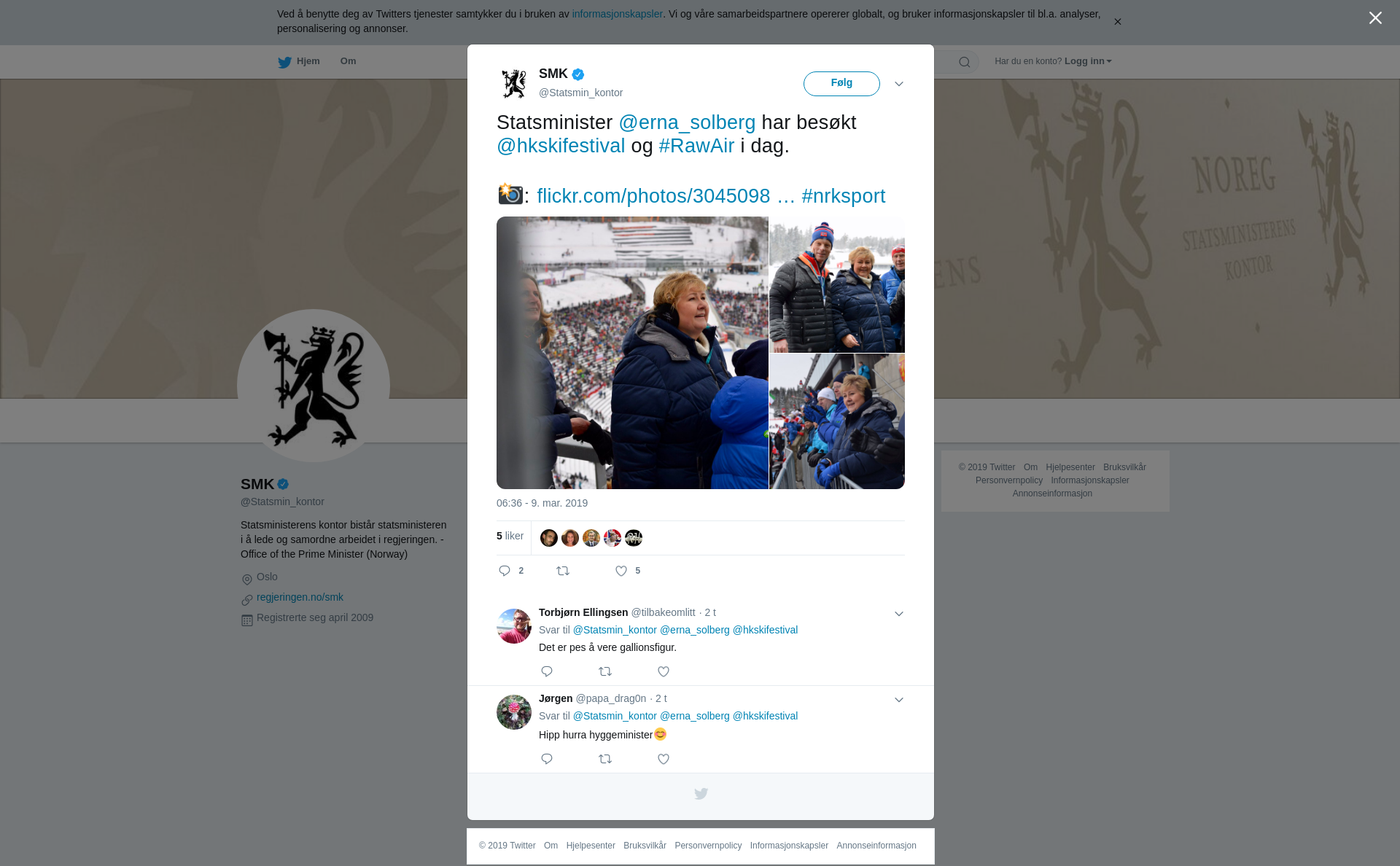 Statsminister @erna_solberg har besøkt @hkskifestival og #RawAir i dag. 📸: https://t.co/D7vUxKY2i0 #nrksport https://t.co/YqDxmTHSUl